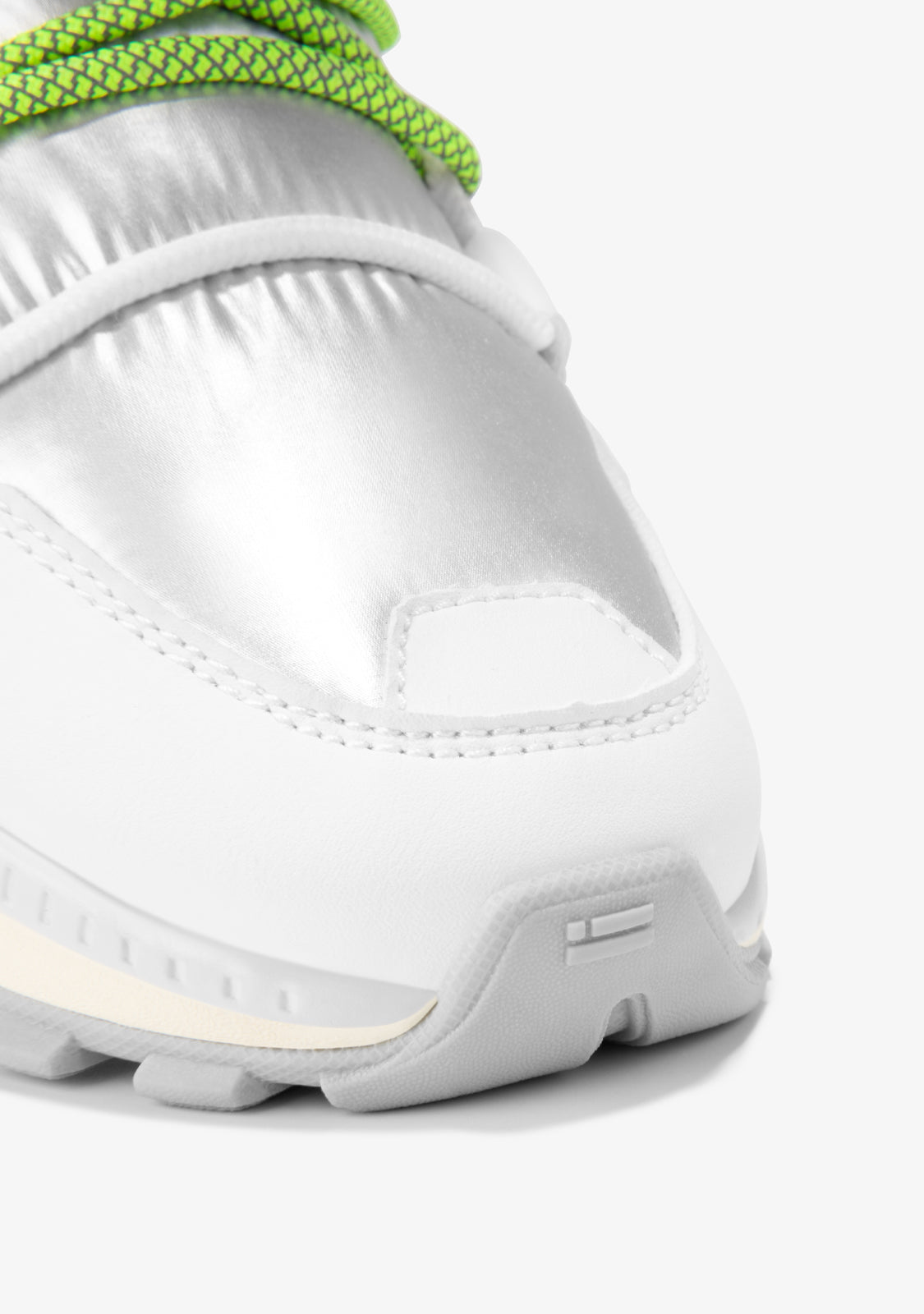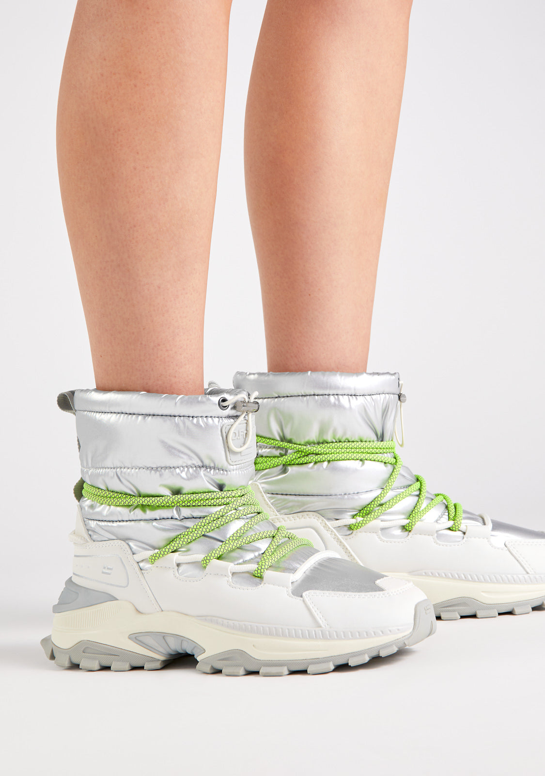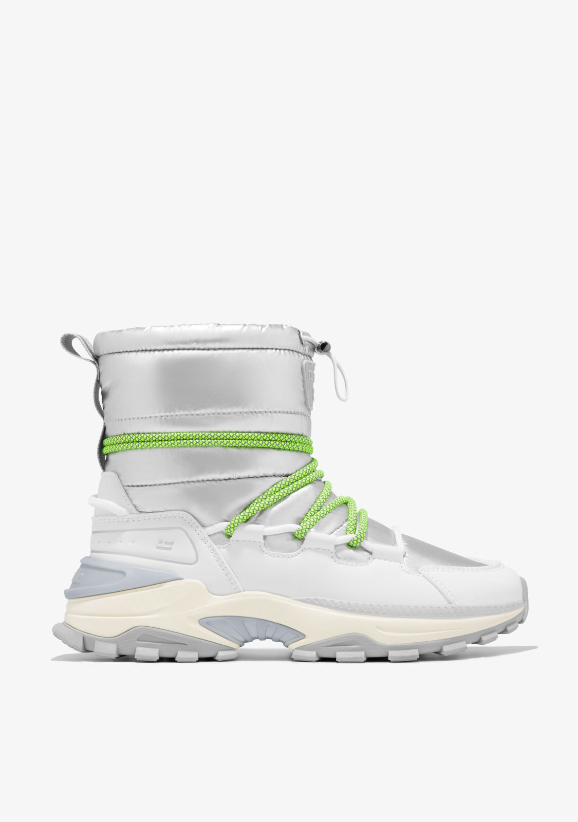 High-cut design crafted with flexible and lightweight materials. This design features a padded finish in silver tones with green multi-position laces. It showcases our flag and lettering on both the heel and front, as well as an adjustable closure at the top.