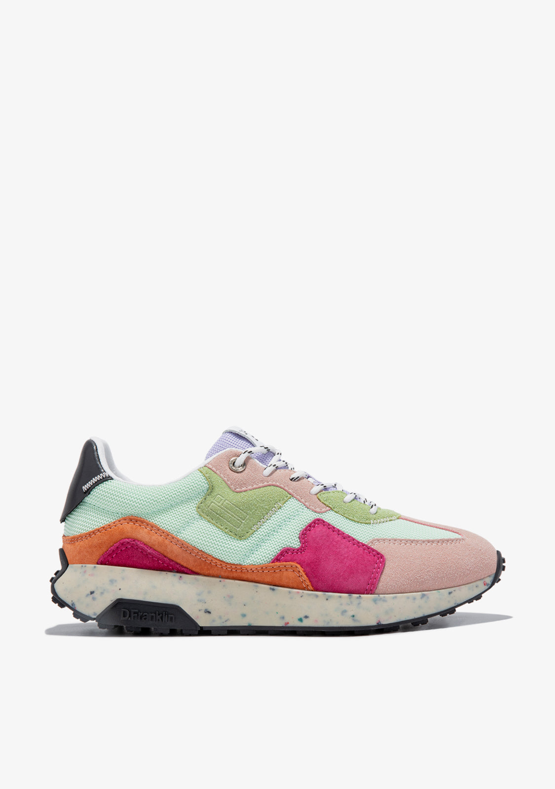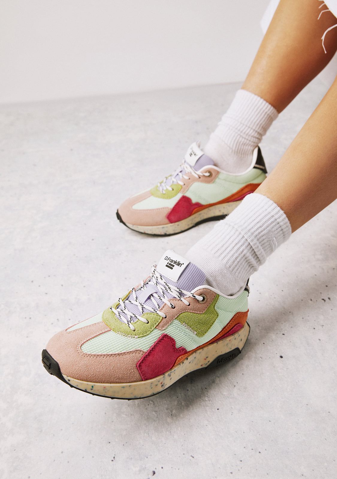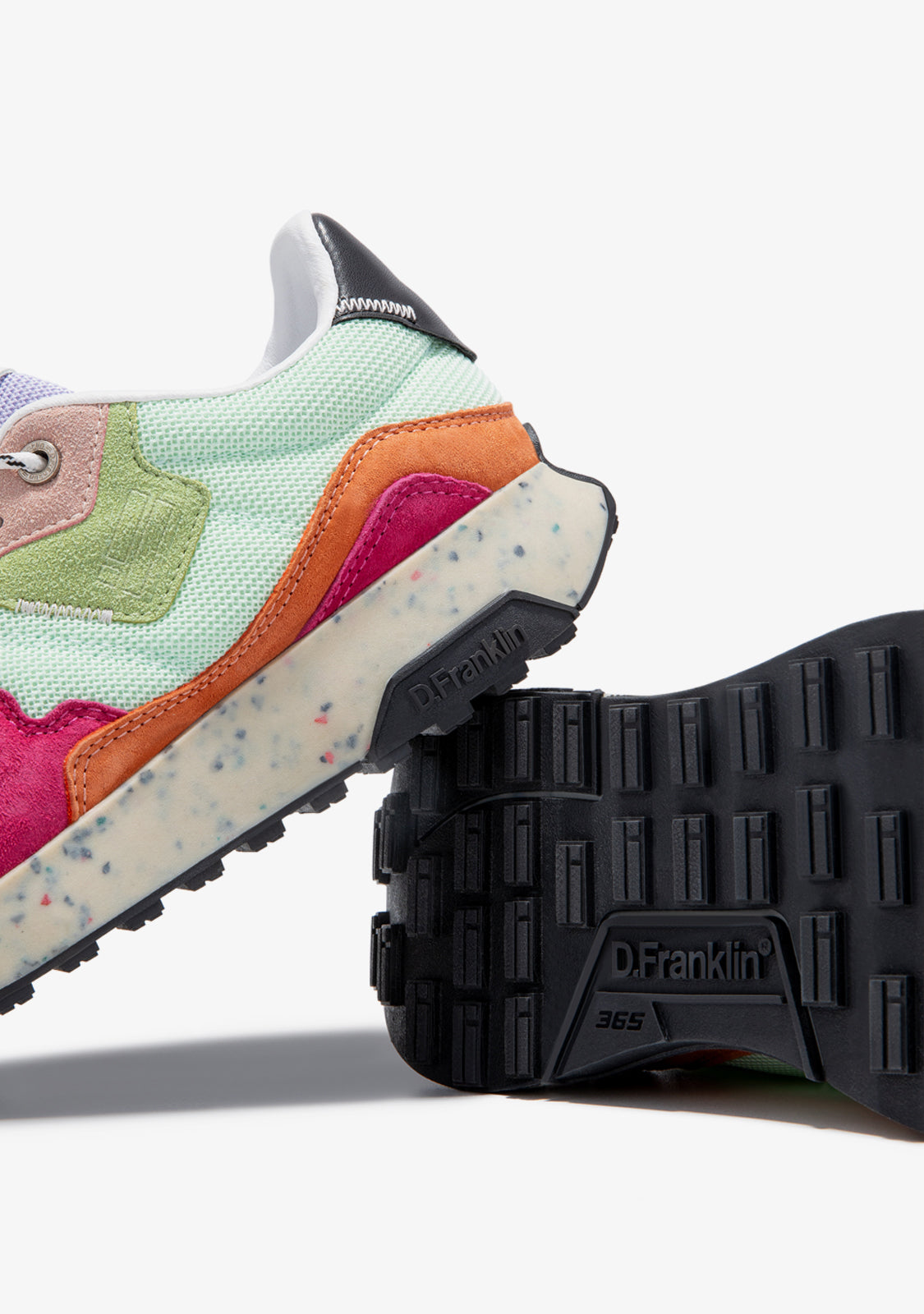 This model combines orange, green and lime tones in a design that stands out for its uniqueness. It features a D.Franklin flag on the side and lace-up detailing for a perfect fit. In addition, it has a two-density sole. The first one is made of recycled materials for a comfortable and light tread, and the second one is embossed to provide grip.