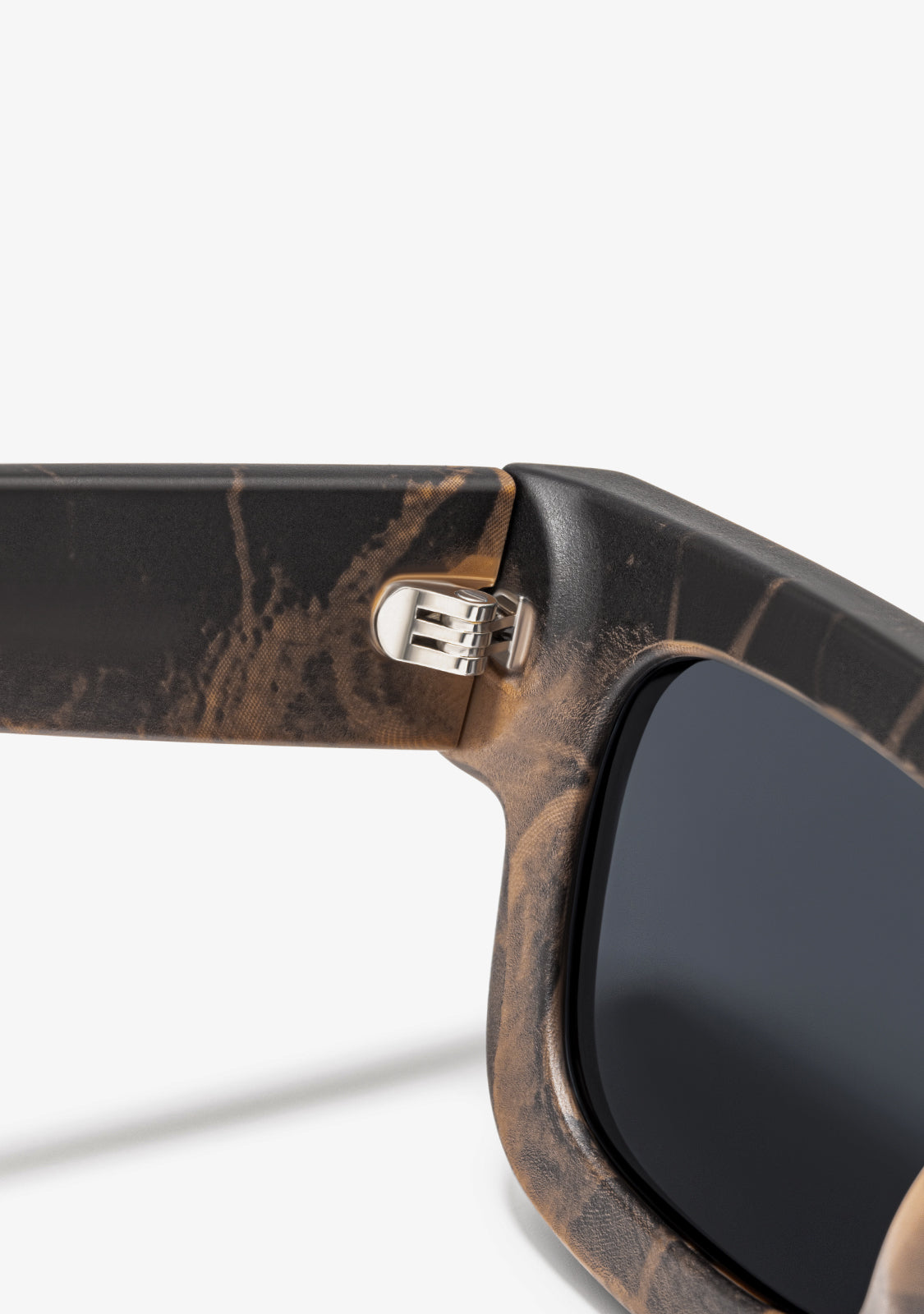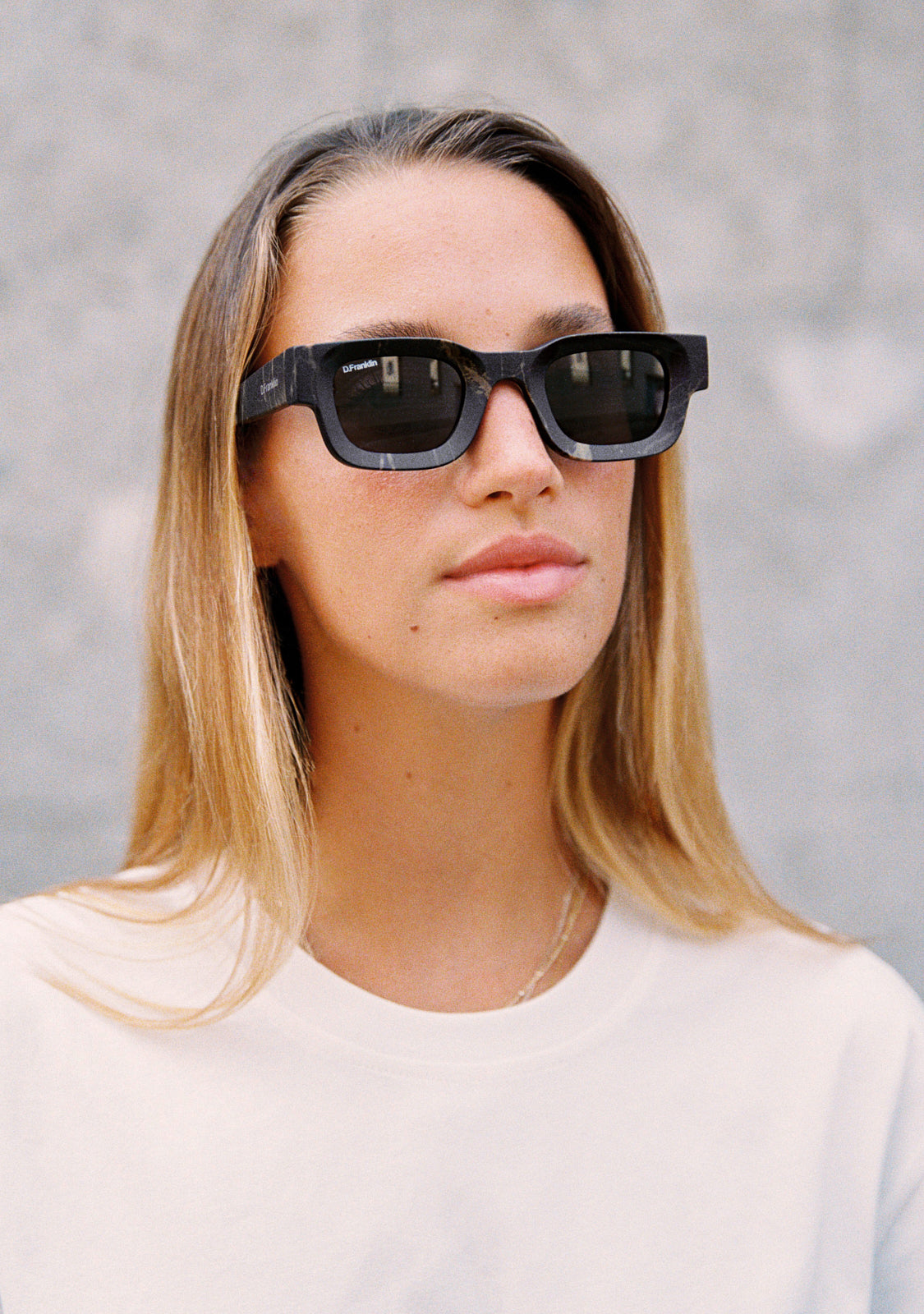Bermuda Wood Grey is a matte finish design made from materials inspired by volcanic stones. Thick frames and smoked lenses represent our different prisms, framed in an oversized rectangular silhouette specially designed to interact with new spaces.