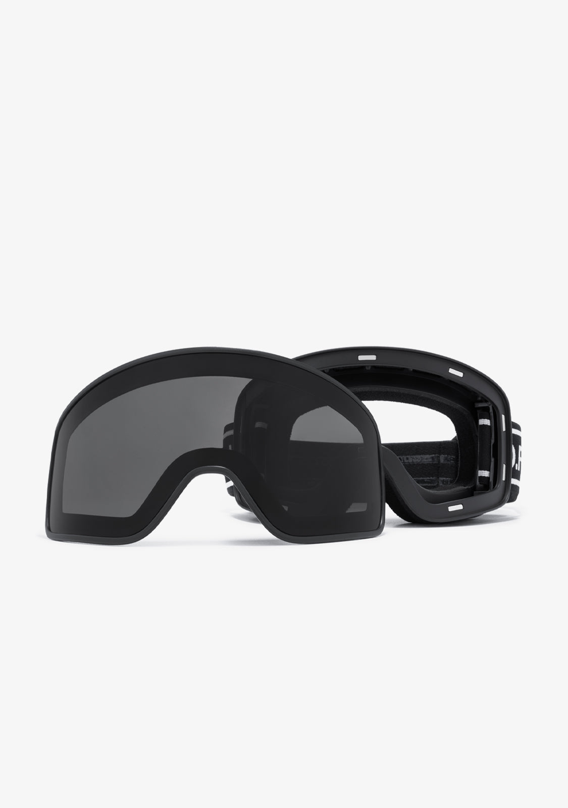 This peak-inspired model features a smoked-effect polycarbonate lens with no limits or frame. It features a dark finish with our signature emblem on the side of its black elastic band. Uniform lens width is 179.5 mm.