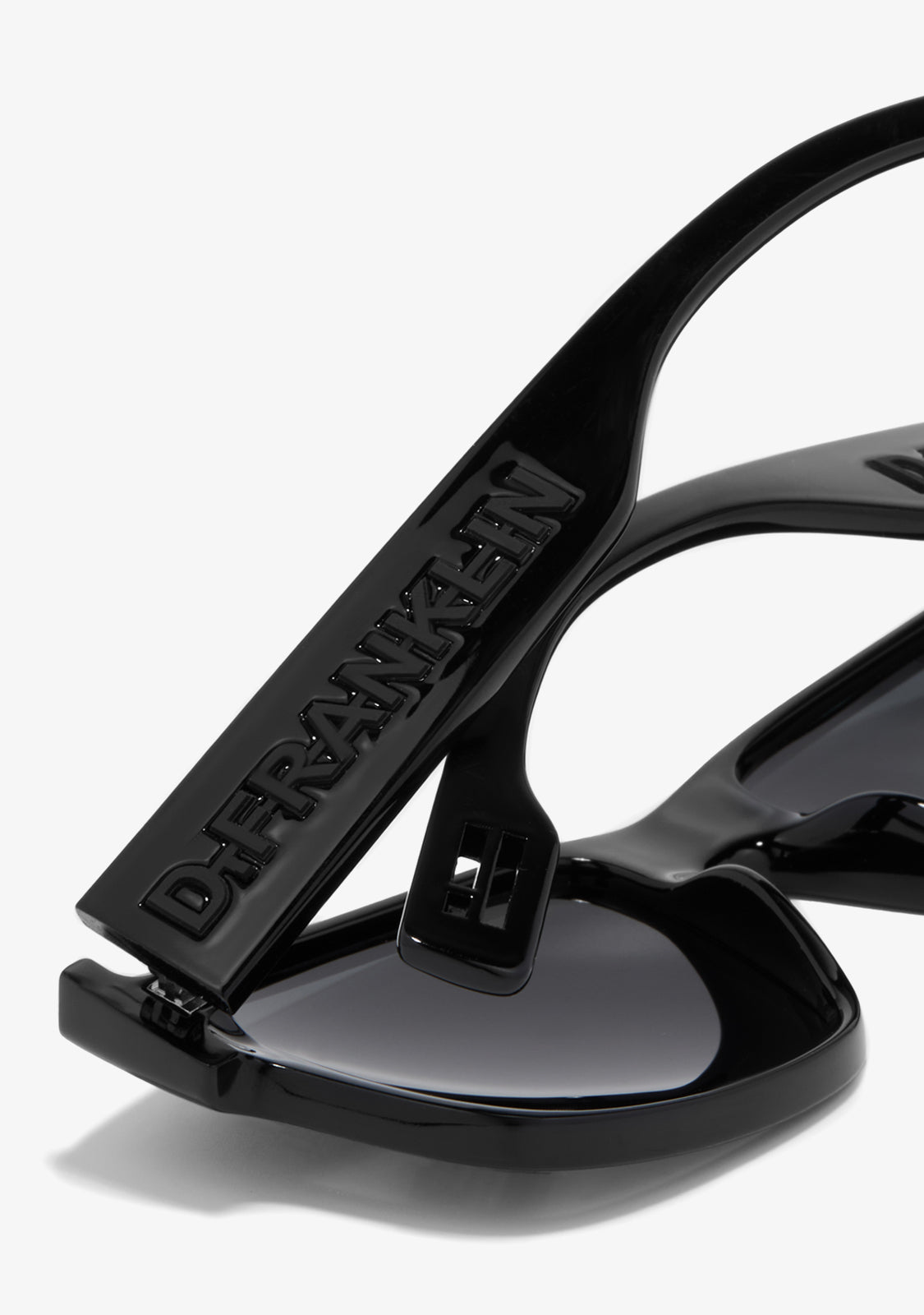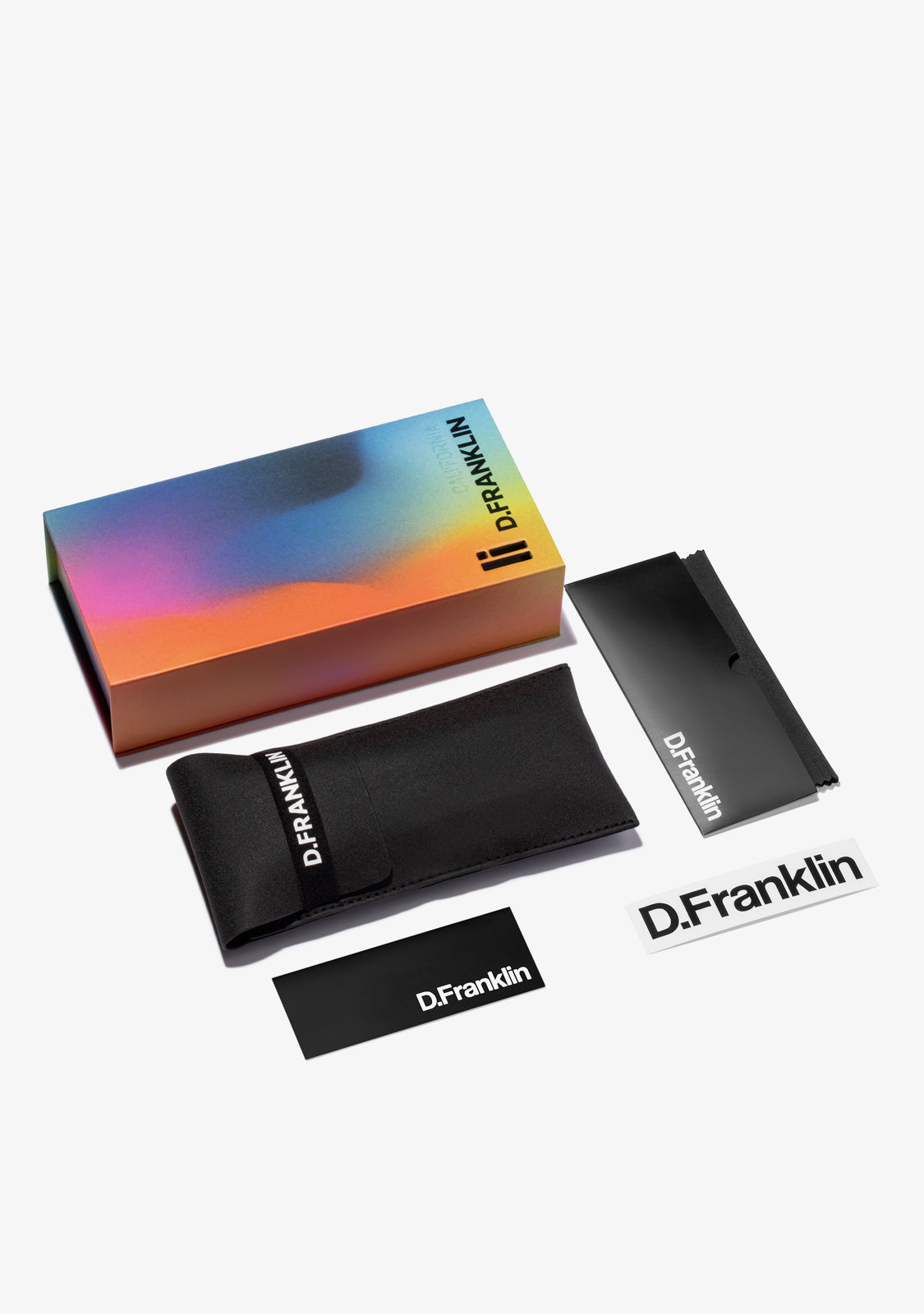 D.Franklin California sunglasses. A model designed in total black and vibrant details. Created with our signature D.Franklin details: logo engraved on both temples and emblem on the right lens. The lens width is 57 mm and the front lens width is 148 mm. Side temples are 145 mm long.