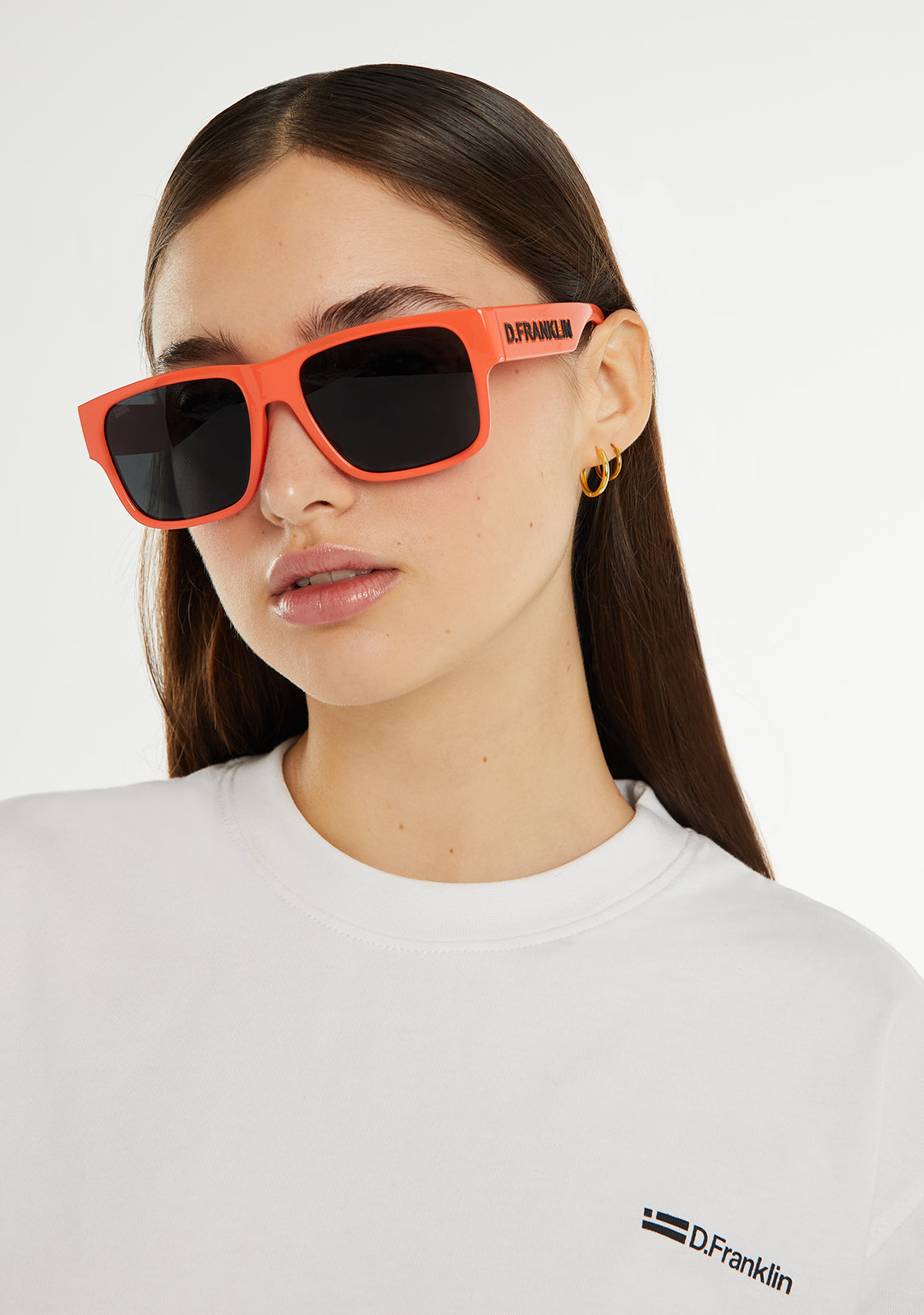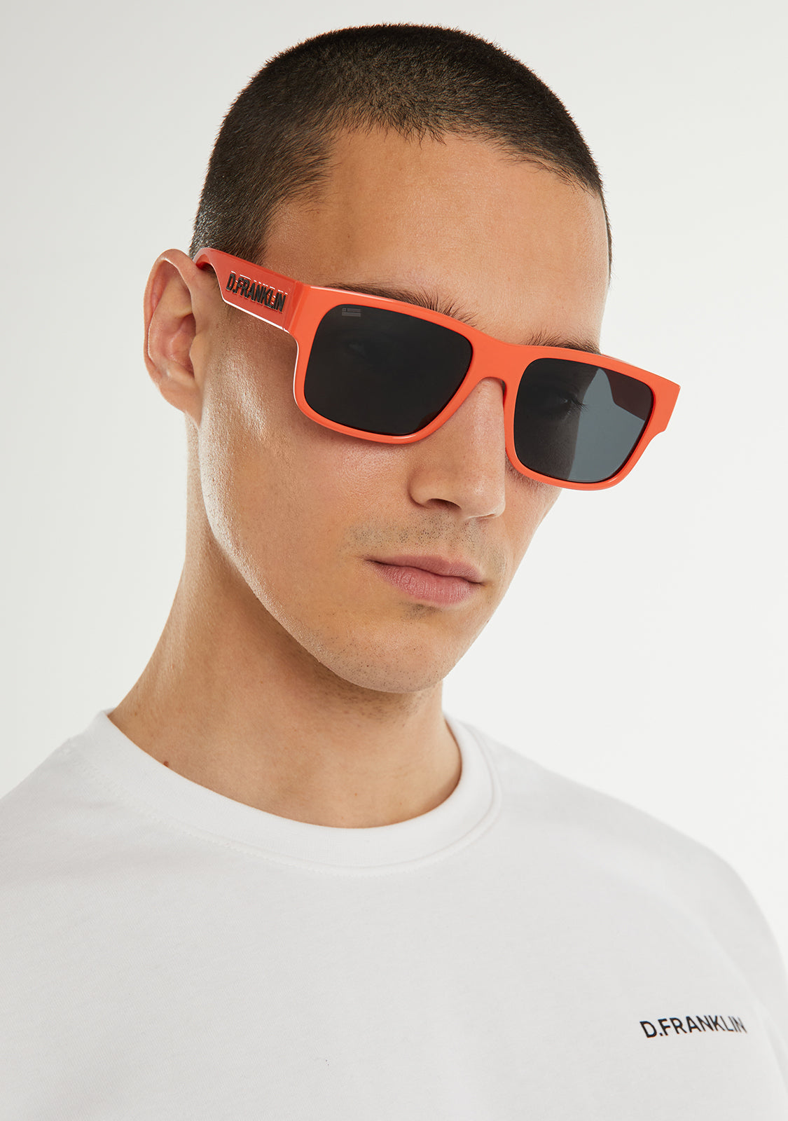D.Franklin California sunglasses. A model designed in orange tones and vibrant details. Created with our signature D.Franklin details: logo engraved on both temples and emblem on the right lens. The lens width is 57 mm and the front lens width is 148 mm. Side temples are 145 mm long.