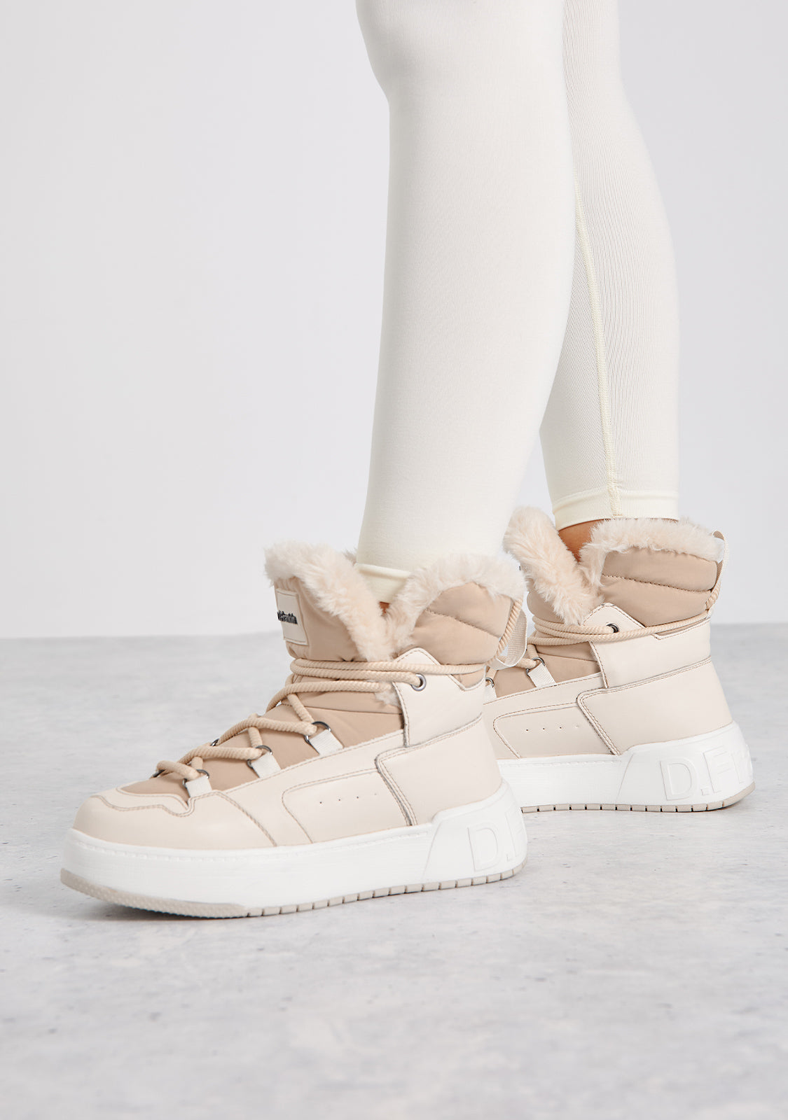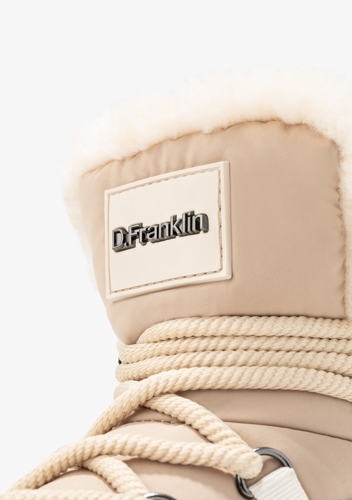 Our fur inside boots feature a quilted finish. This beige model features matching multi-position laces for grip and cushioning.