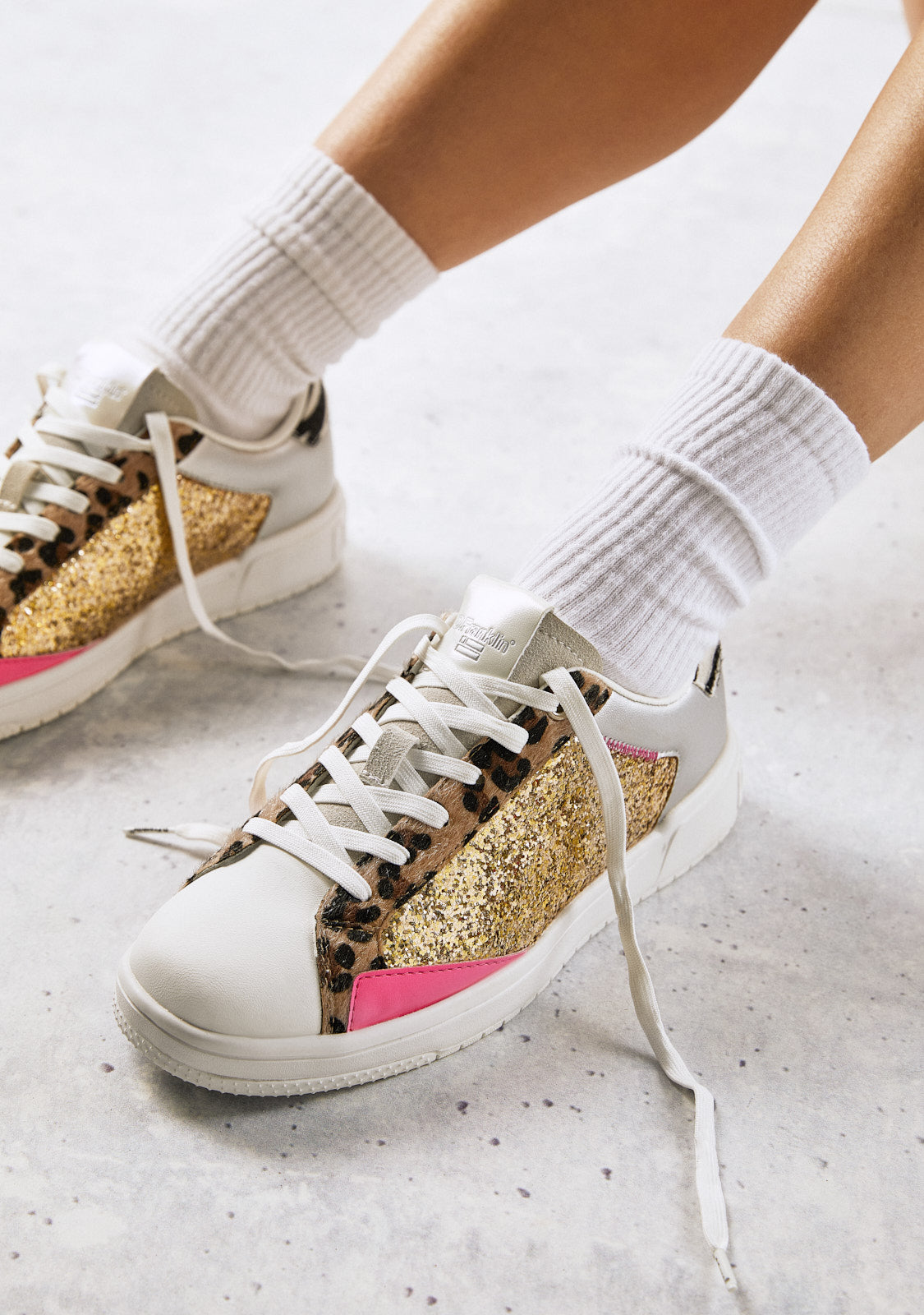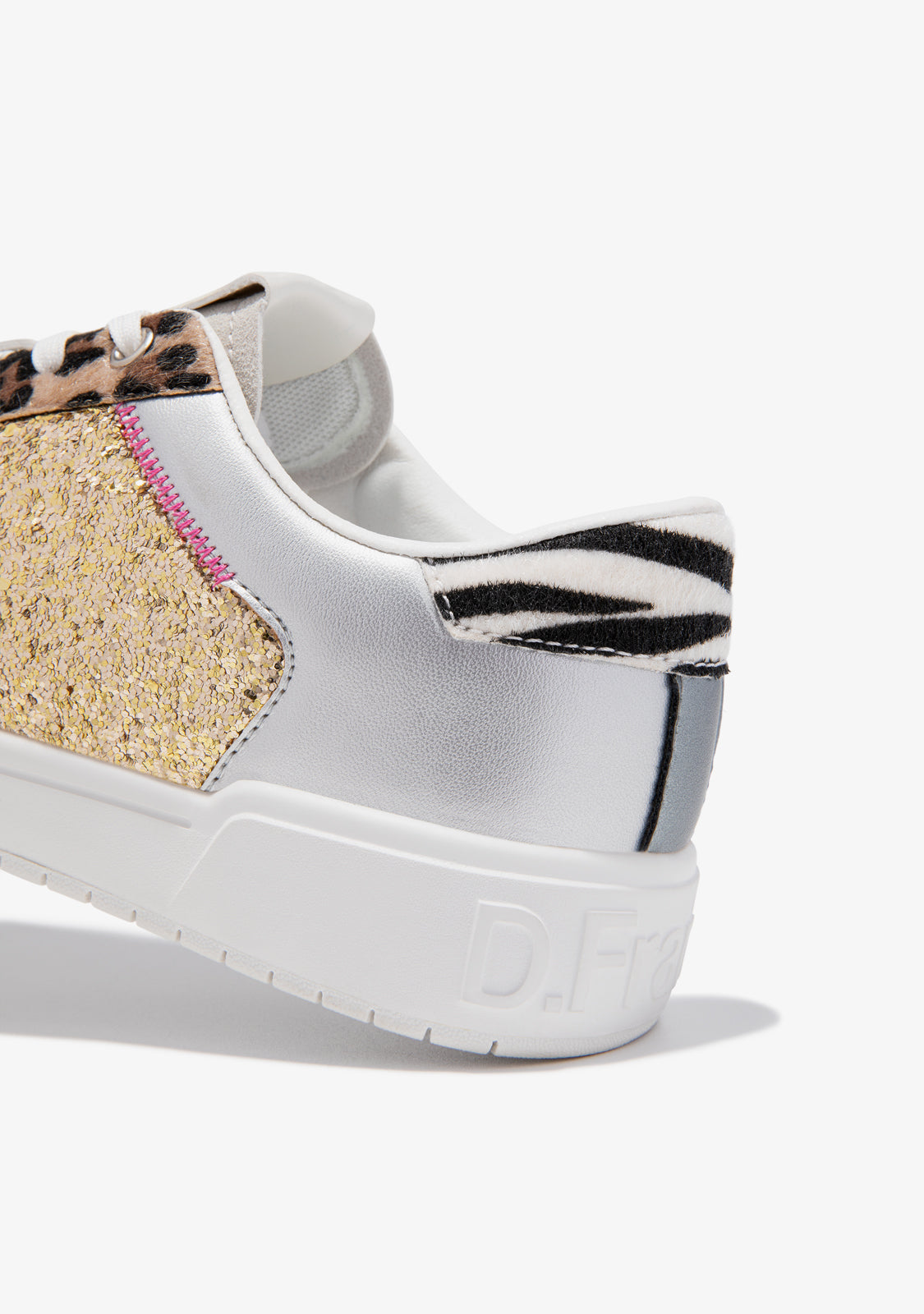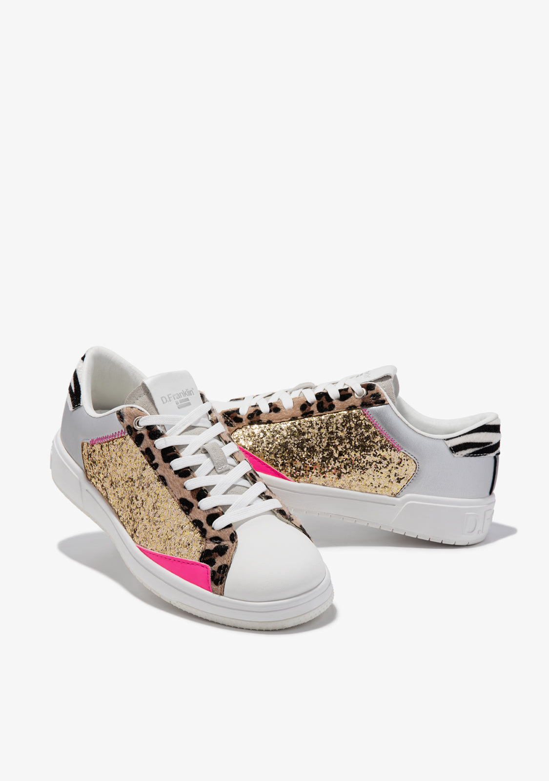 The Court V2 Tennis Basic Glitter Gold Leo D.Franklin model is made with silver, pink and glitter gold details as well as leopard and zebra print. They feature a logo-embossed sole on the heel, sole and side. With a redesigned 2cm high sole and phylon sole for lightweight cushioning. The anatomical footbed is also removable.