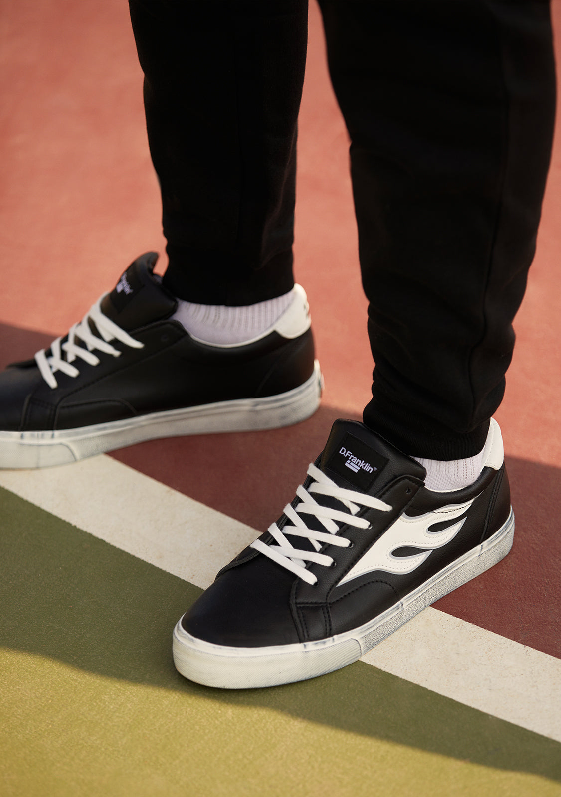 Crafted in black faux leather with white flame detailing on the side. These trainers feature cotton laces as well as our emblem and flag on the heel. The slip-resistant sole allows for a comfortable, extra-light footprint.