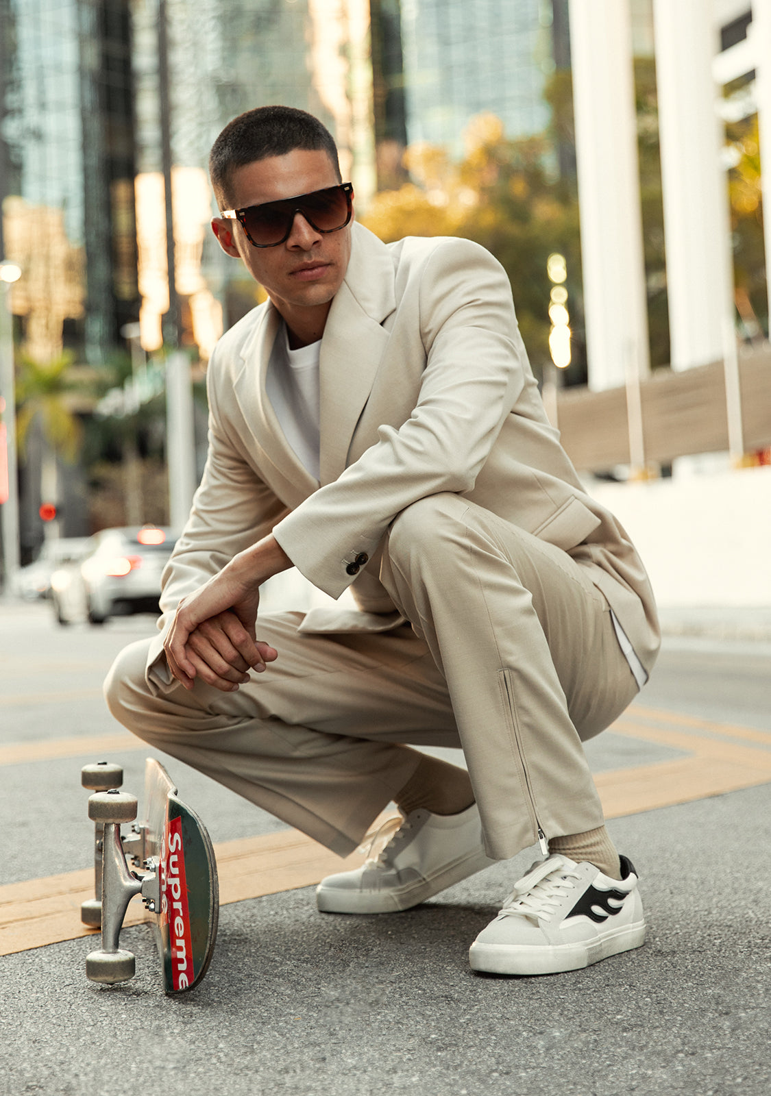 Low-cut trainer inspired by the skateboarding scene in Venice Beach, Los Angeles. Flame detail on the side in black on white recycled textile and grey details. Embossed logo at heel on black background. Cotton laces.