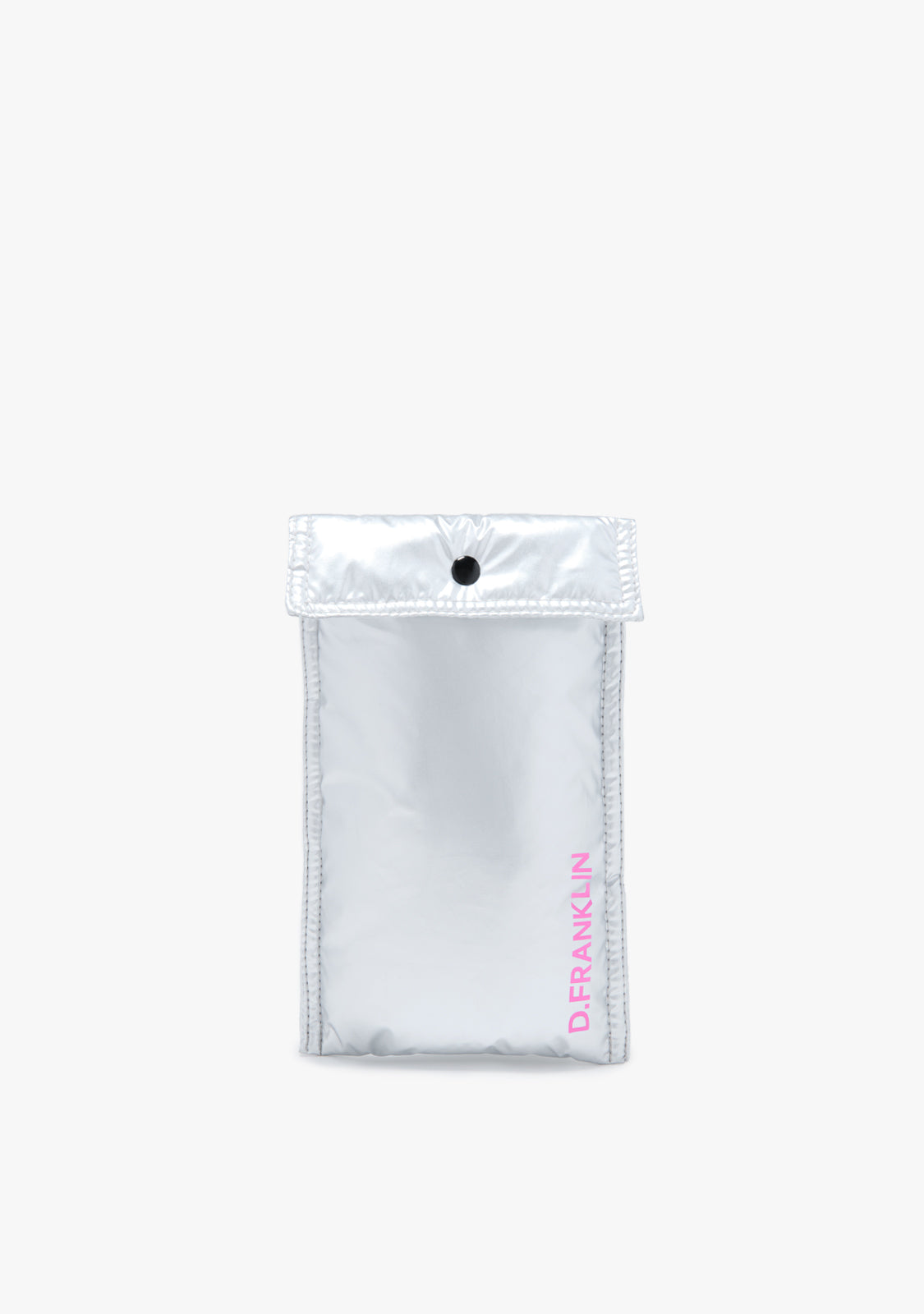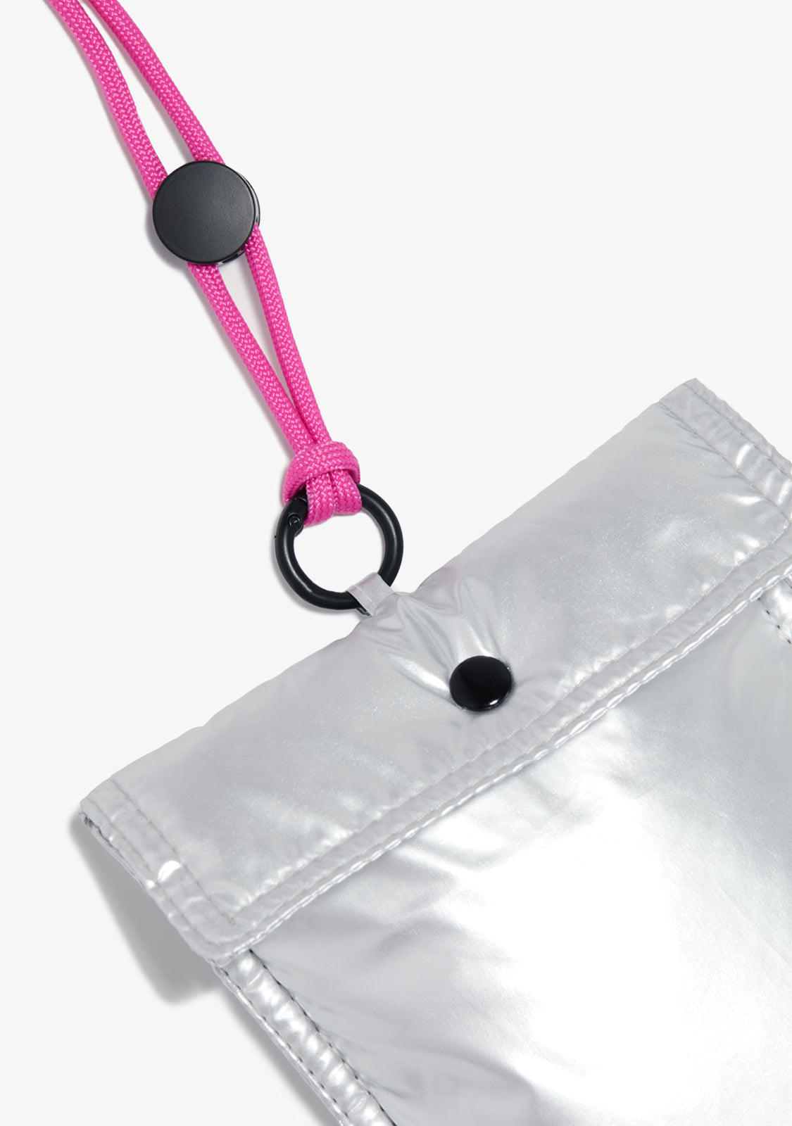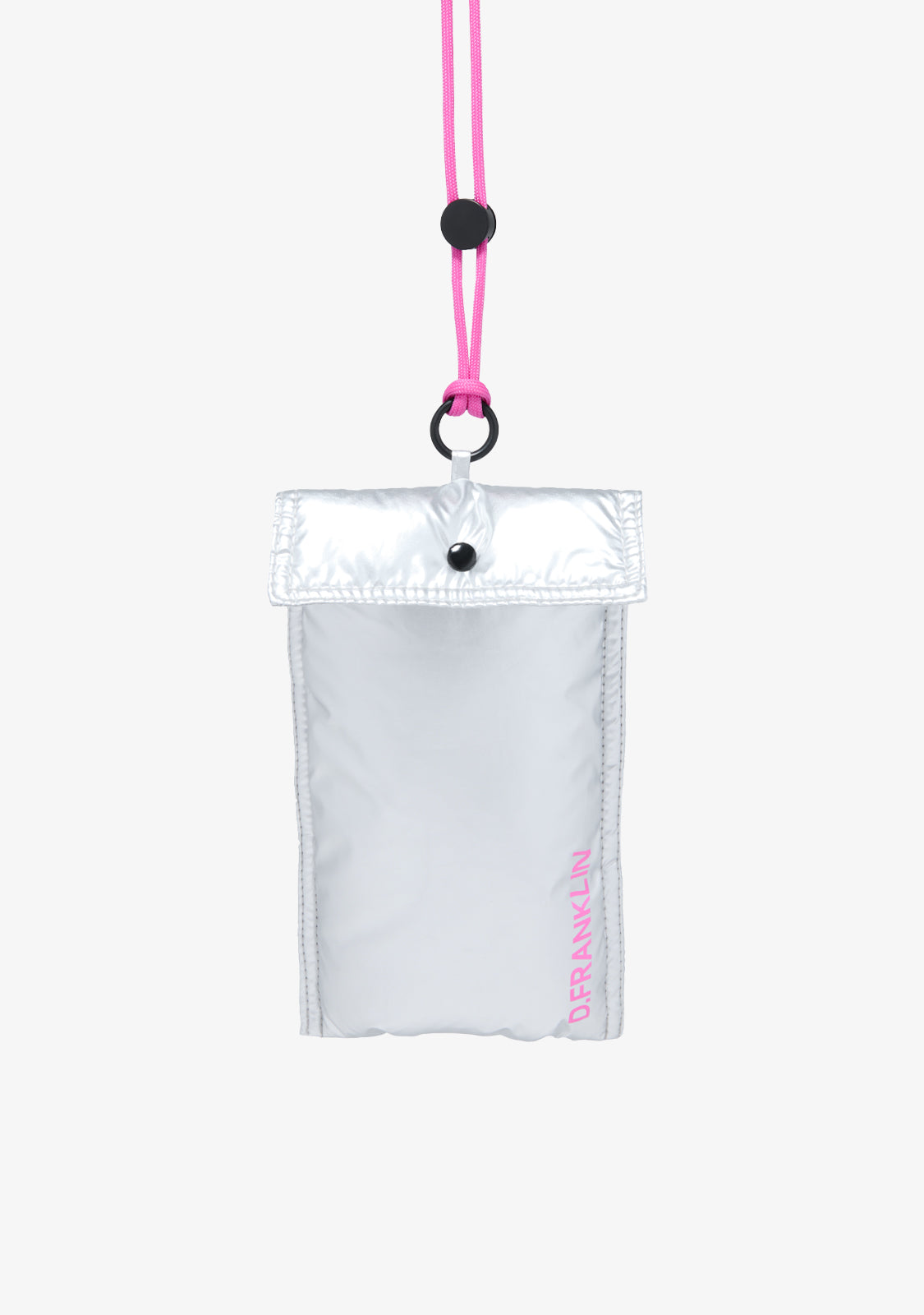 This model with an iridescent silver finish has a removable fuchsia cord thanks to its metal ring that allows you to adapt its length. It features a button fastening and a fuchsia screen-printed D.Franklin logo on the front.