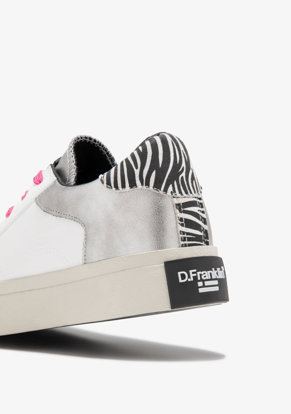 The Half Moon model captures the stellar aesthetic by combining shiny textures in silver and lime tones and zebra print. It features a quilted upper and pink lace-up fastening. It also features personalised lettering on both the side and heel.