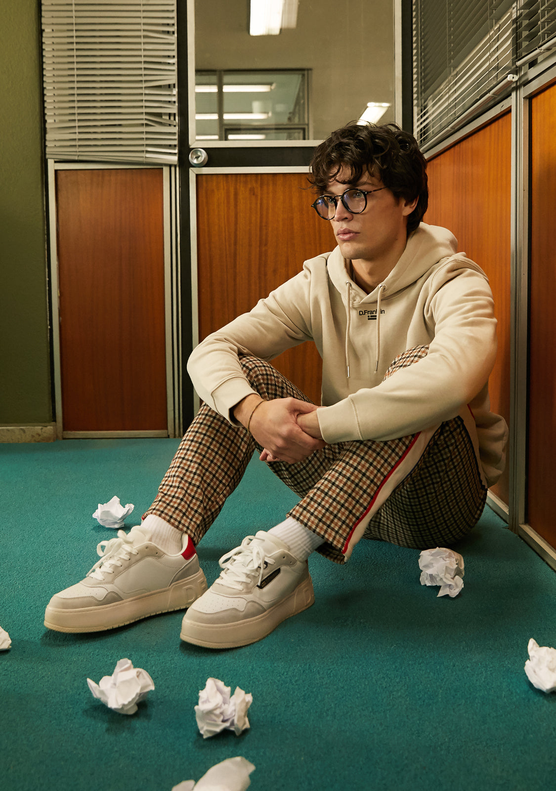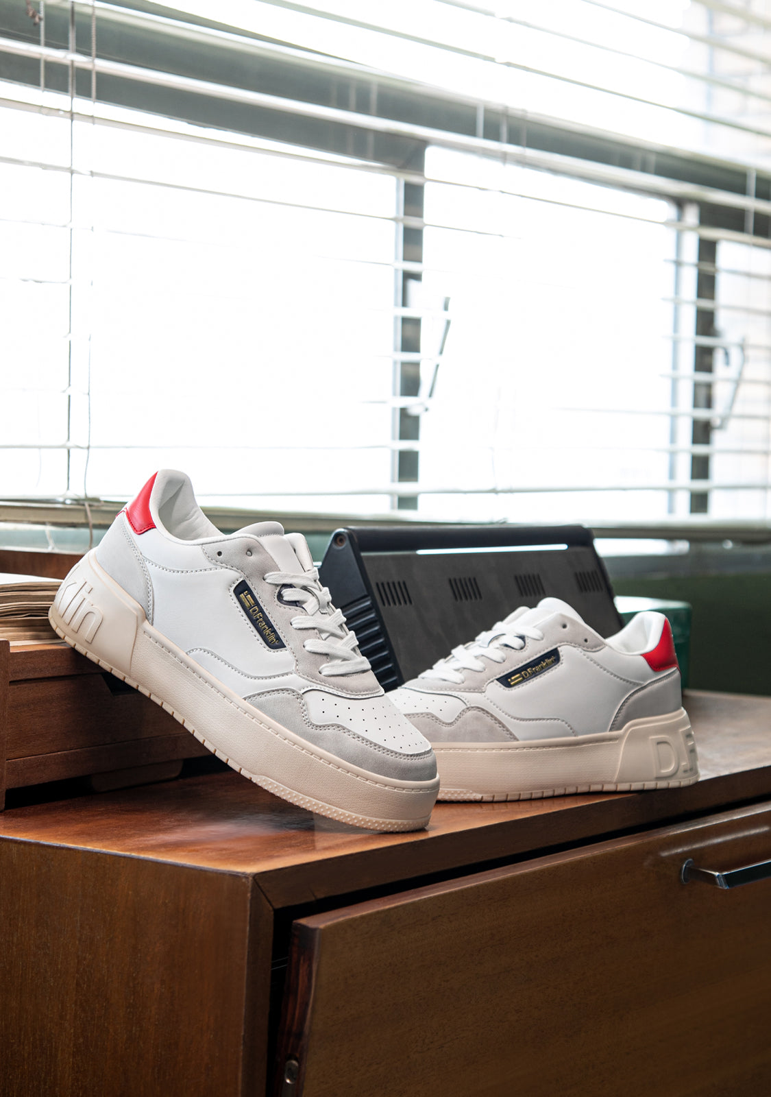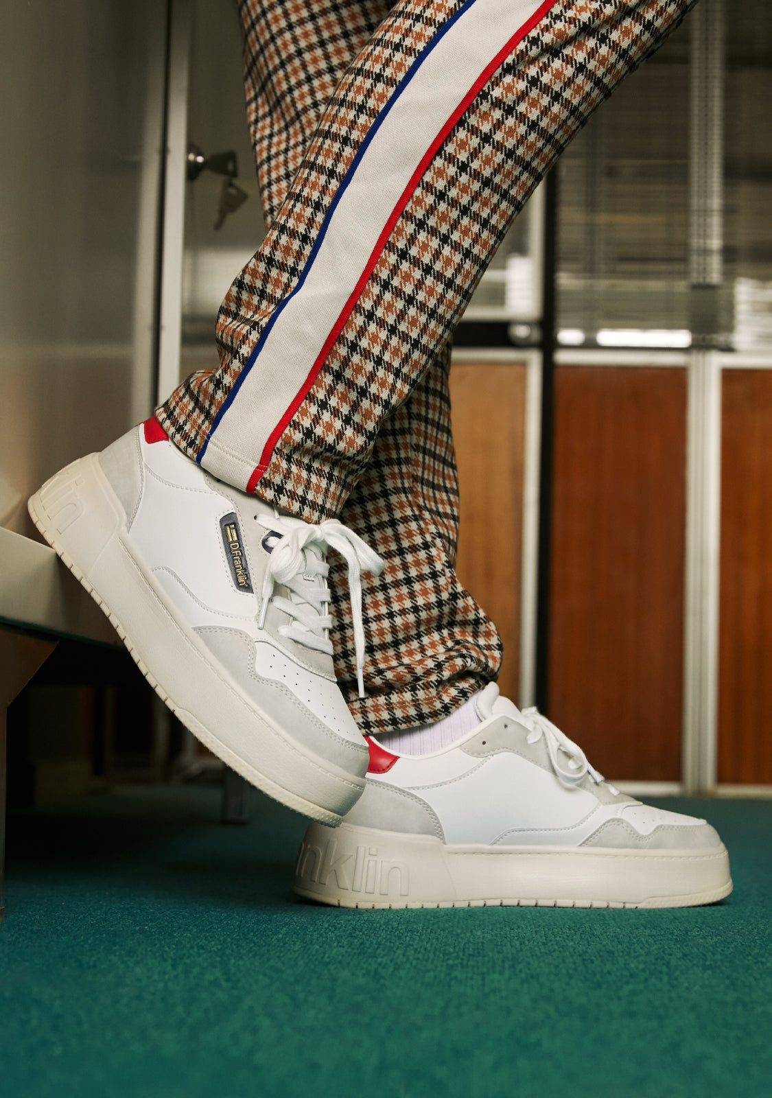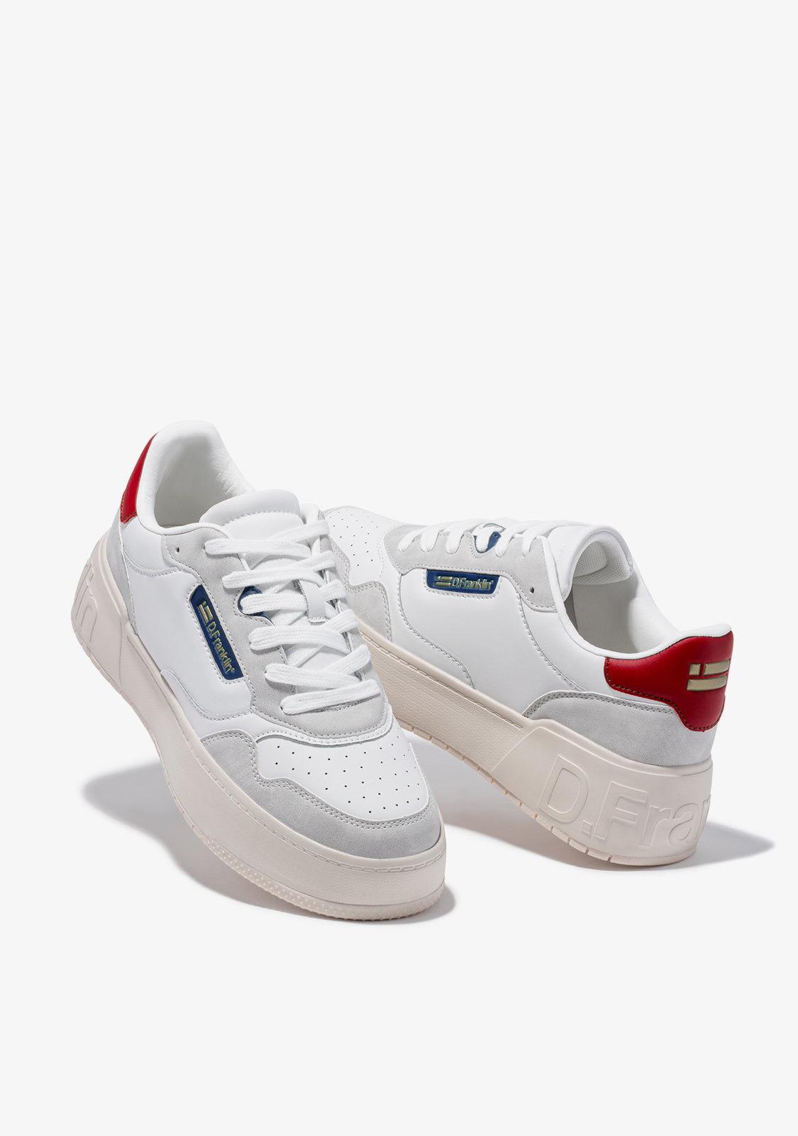 A refined approach inspired by the '90s basketball scene. Minimalist trainer with red heel and D.Franklin emblem on the side in gold tone on navy blue. Contrasting grey parts on white vegan synthetic leather. Constructed with rubber sole. Embossed D.Franklin logo on heel. Cotton laces. 4 cm sole.