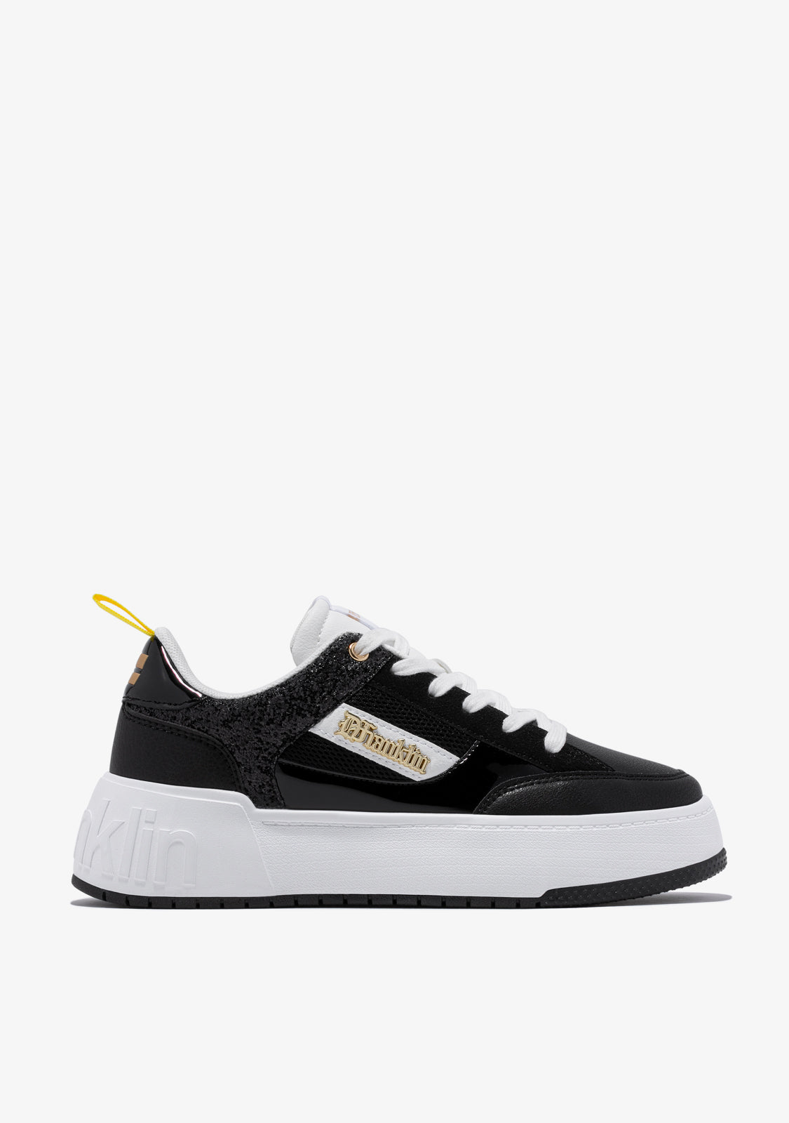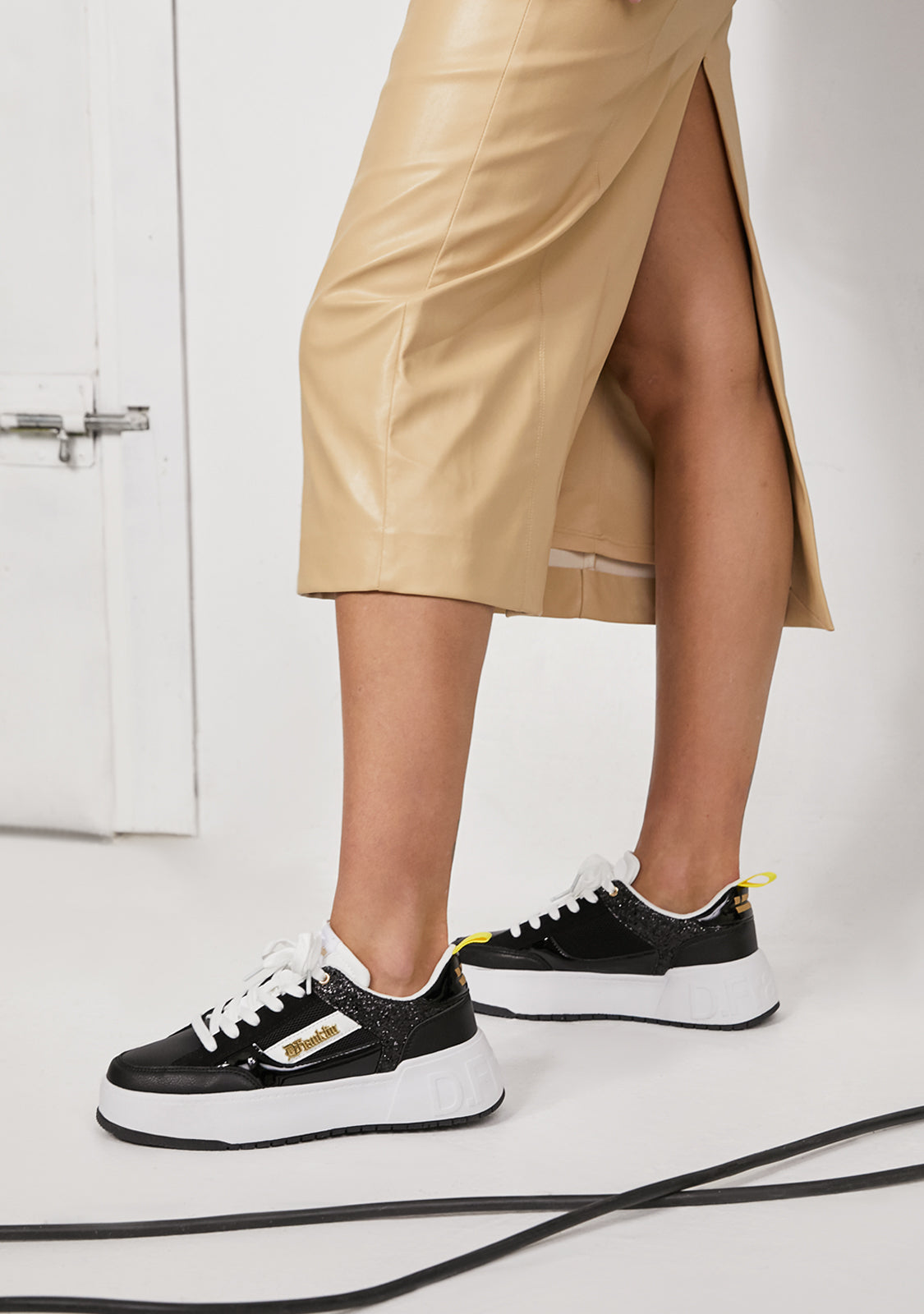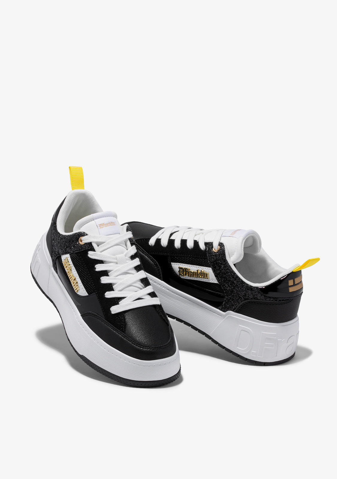 Designed to bring back the adrenaline rush of our iconic Court shoe. Inspired by the '90s basketball trend. With black glitter to redefine classic. Iconic D.Franklin emblem in gold on white vegan synthetic leather. Constructed with a rubber sole. Embossed D.Franklin logo at heel. Cotton laces. 4 cm sole.