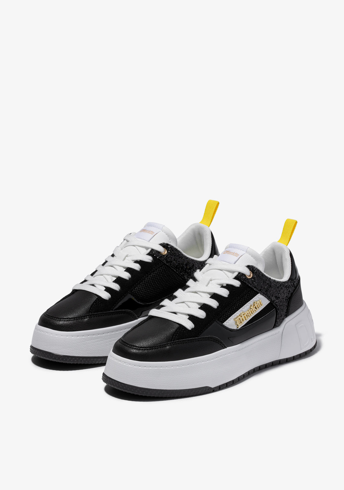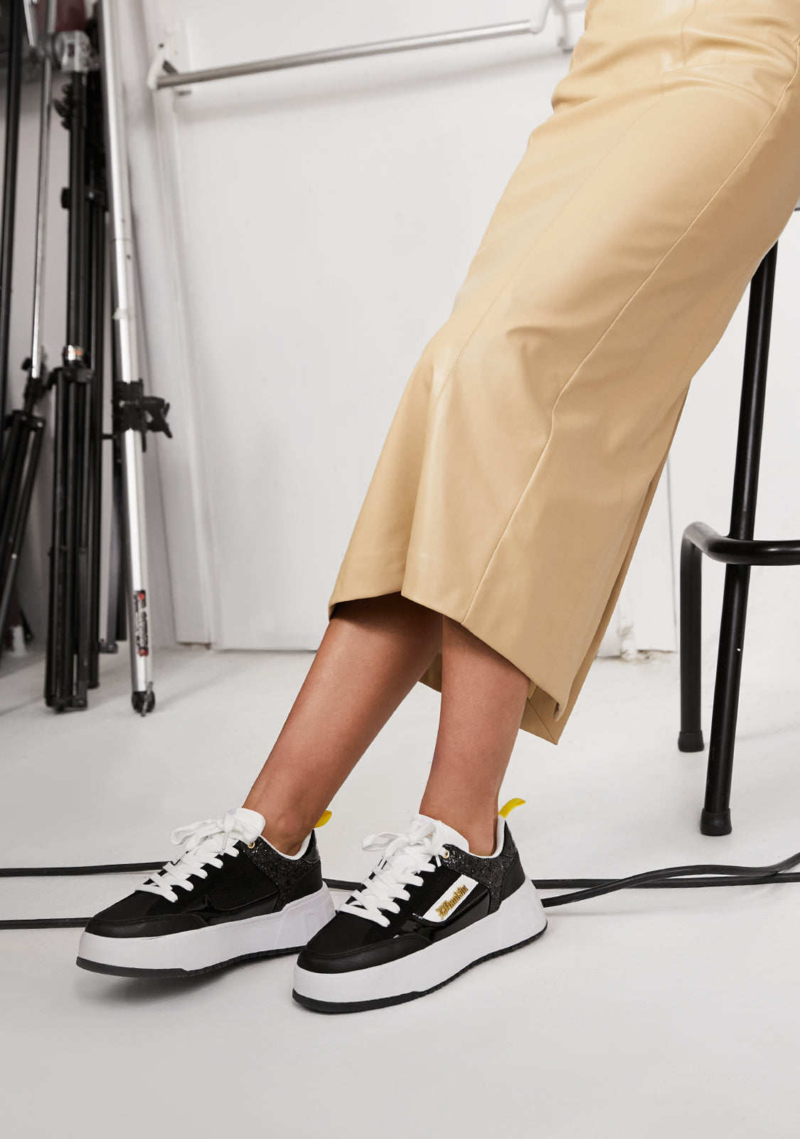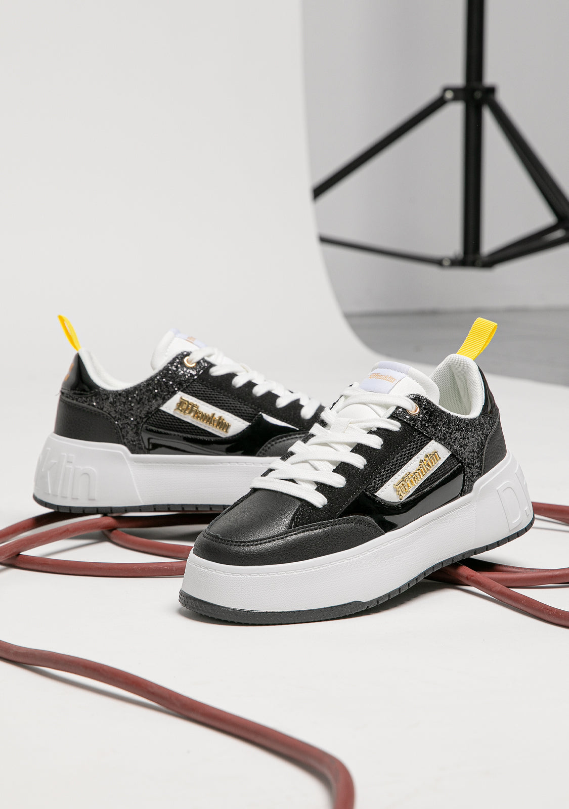 Designed to bring back the adrenaline rush of our iconic Court shoe. Inspired by the '90s basketball trend. With black glitter to redefine classic. Iconic D.Franklin emblem in gold on white vegan synthetic leather. Constructed with a rubber sole. Embossed D.Franklin logo at heel. Cotton laces. 4 cm sole.