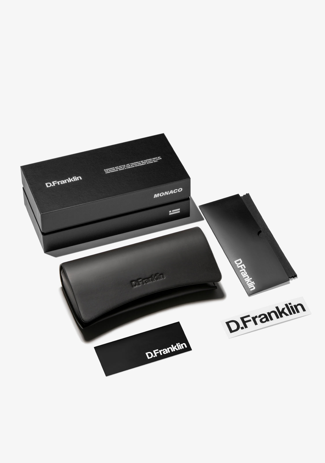 Our Monaco model in black features the most distinctive D.Franklin details, the logo engraved on the temples and emblem on the lens. The lens width is 55 mm and the front is 152 mm. The side temples are 150 mm long, perfect for all faces.