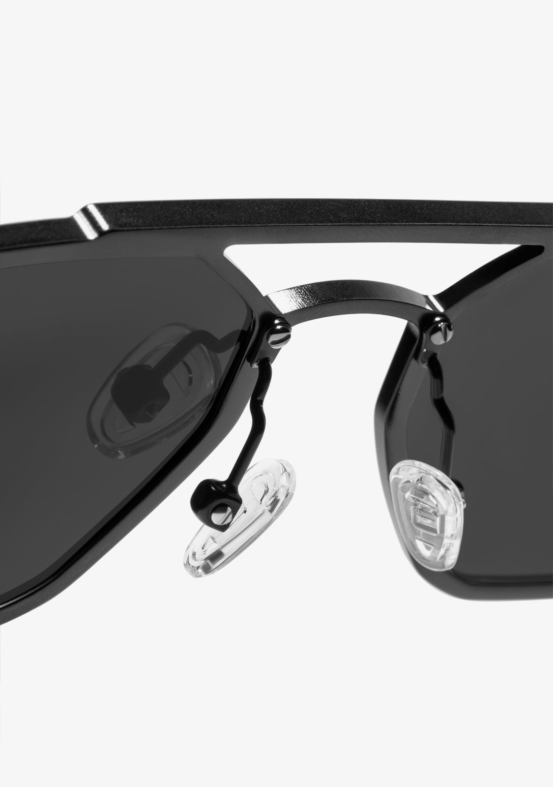 Thanks to their aluminium construction, these glasses are ultra-lightweight. They feature dark polarized lenses and a matte black frame for a distinctive aesthetic. The design features our emblem on the right lens and metallic logo on the side of the temples. It has a 143 mm front frame and a lens width of 52 mm, which fits most faces. The temples are 138 mm long.