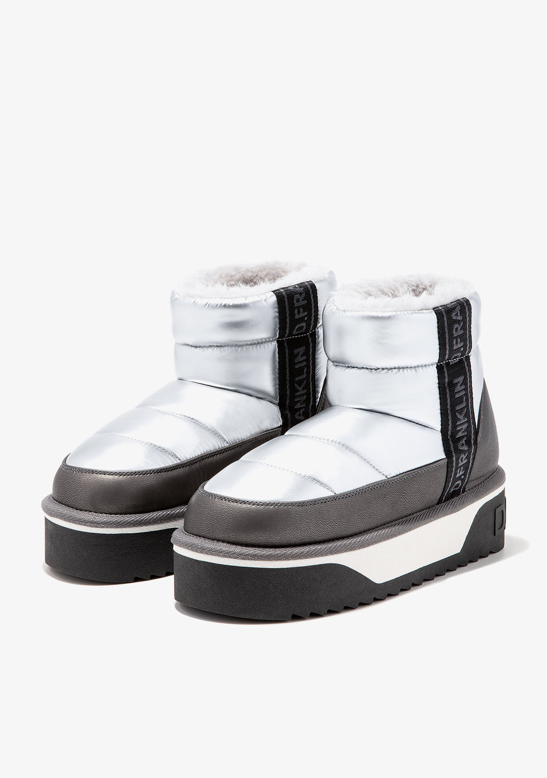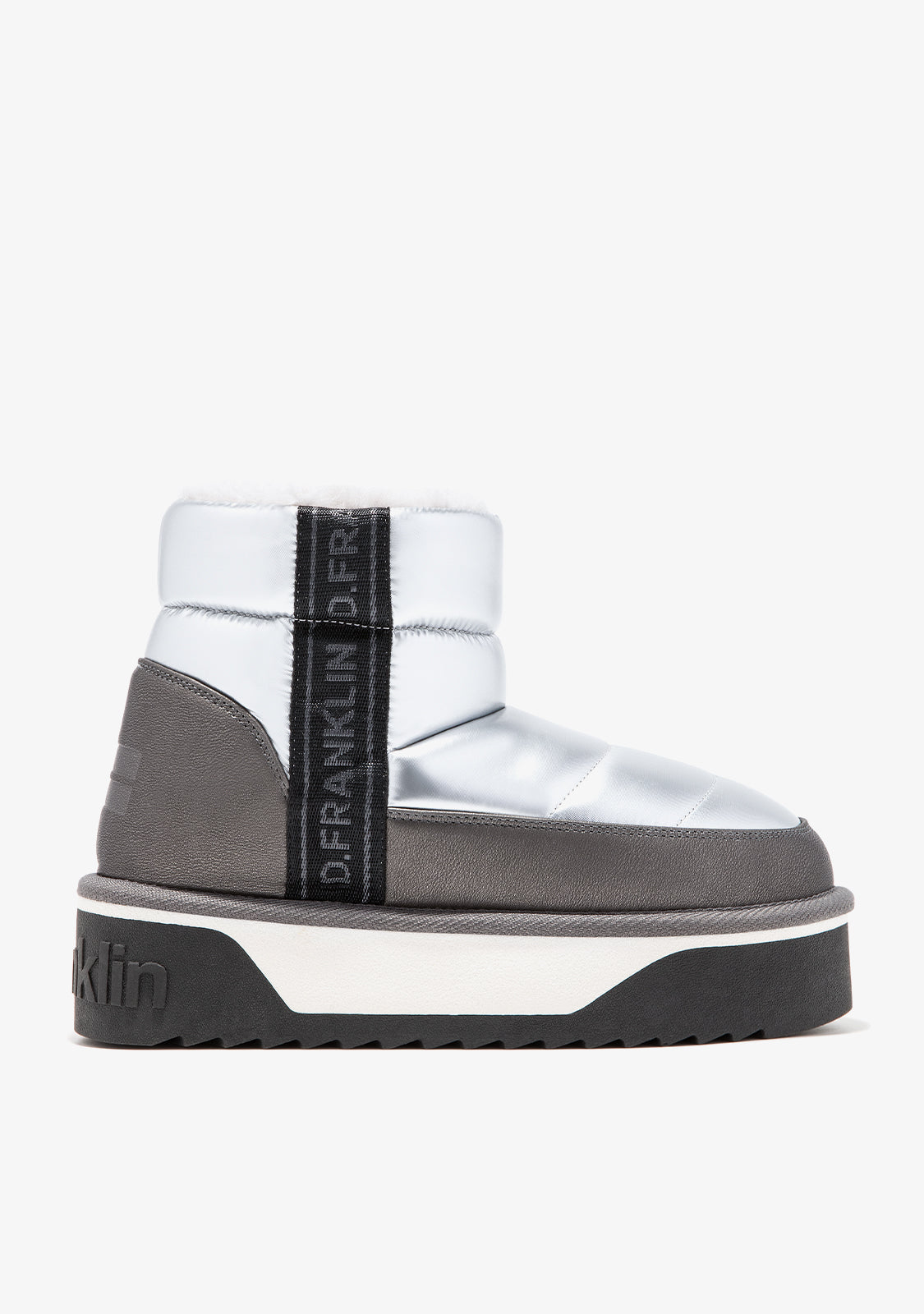 Straight-cut shaft design in silver tones and synthetic inner lining for superior warmth.