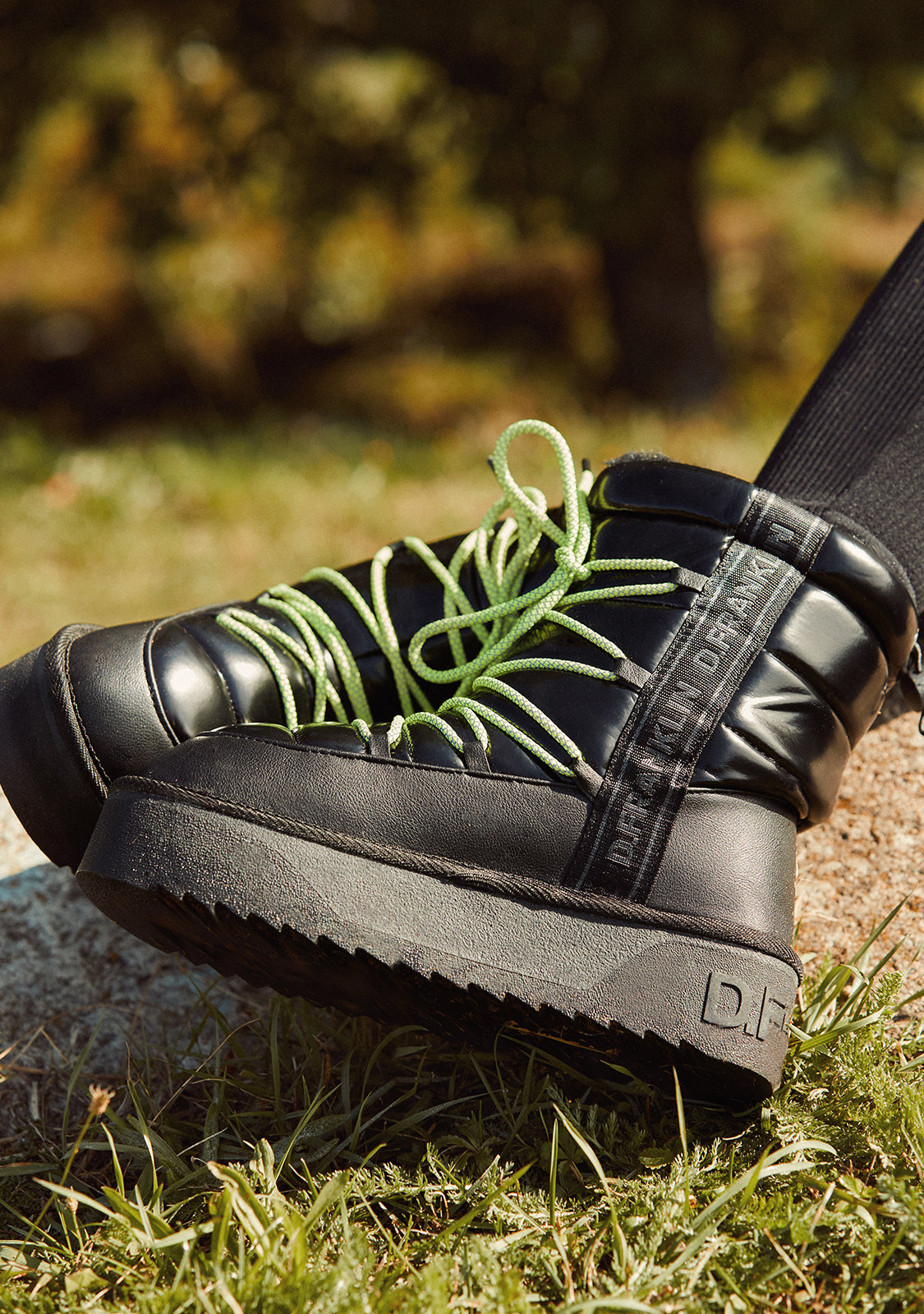 We define cold days with a warm and distinctive piece. This model is made with high-quality, lightweight, and flexible fabrics. Its double-height sole provides great comfort. Additionally, it features our custom emblem on both the heel and the side. Its green laces ensure a perfect fit and support and include reflective details.