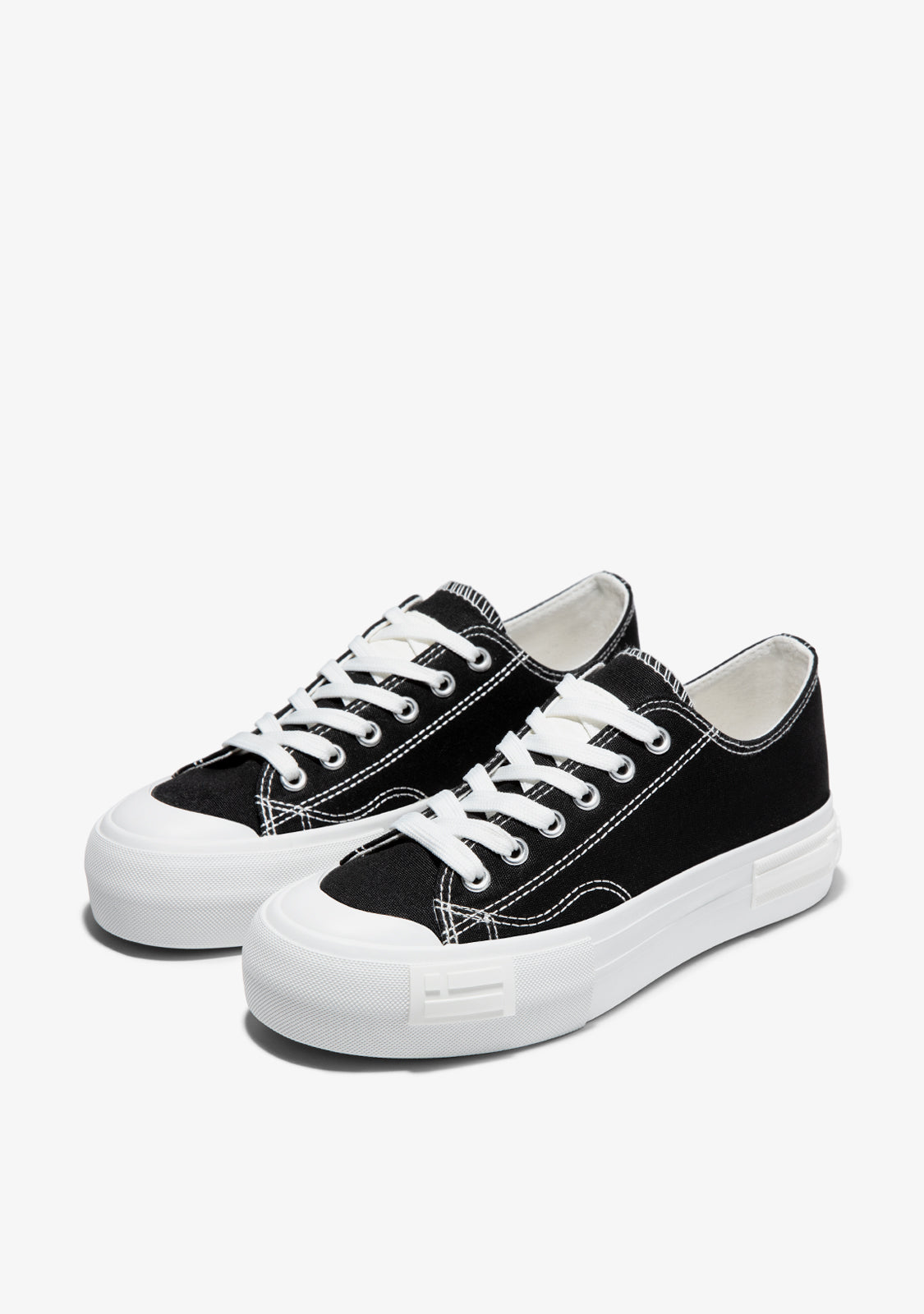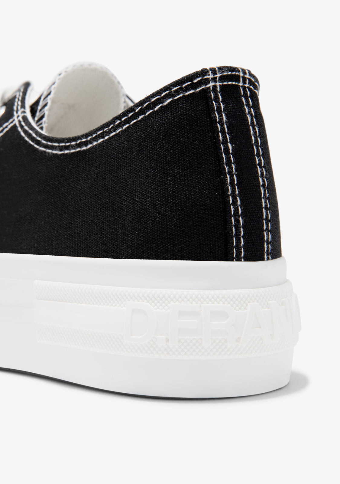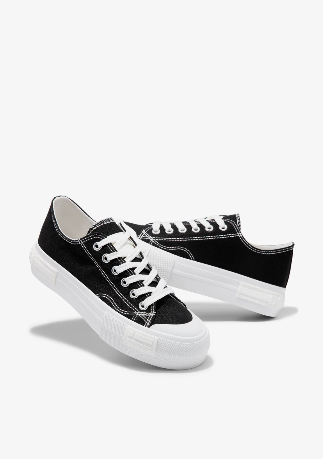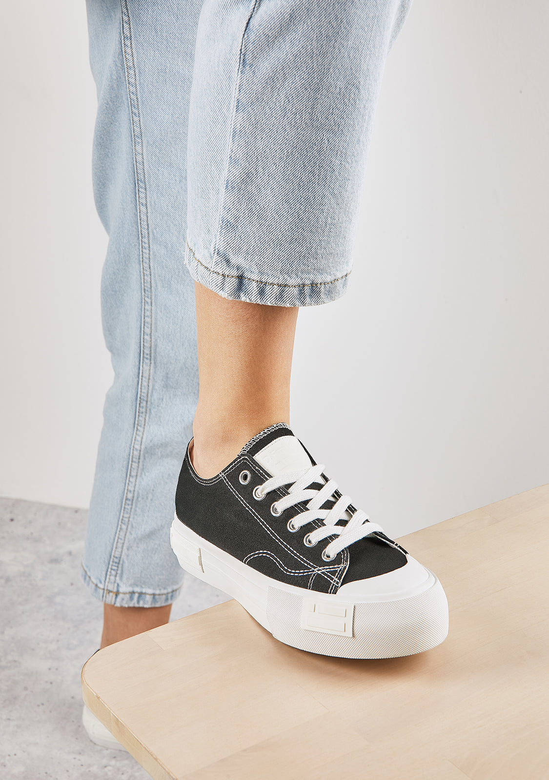 Our black One Way design is constructed from canvas textile. White rubber sole and custom lettering on the heel. Featuring a 4cm height and our flag emblem on the side.