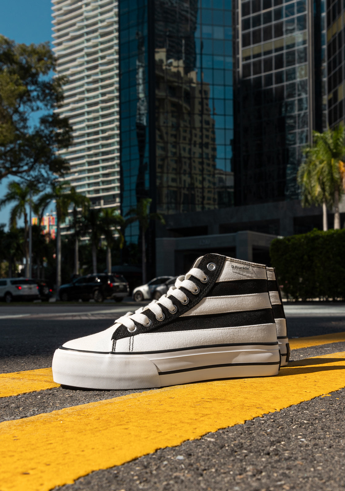 A retro take on the classic One Way high top trainer. Designed with a black and white striped pattern. Constructed with an extra-light 4cm white sole. Black embossed logo on the heel. White cotton laces.