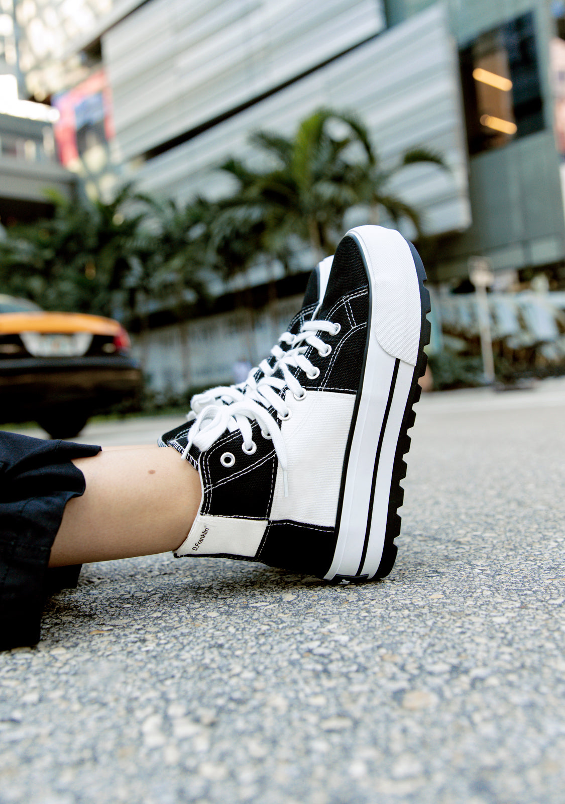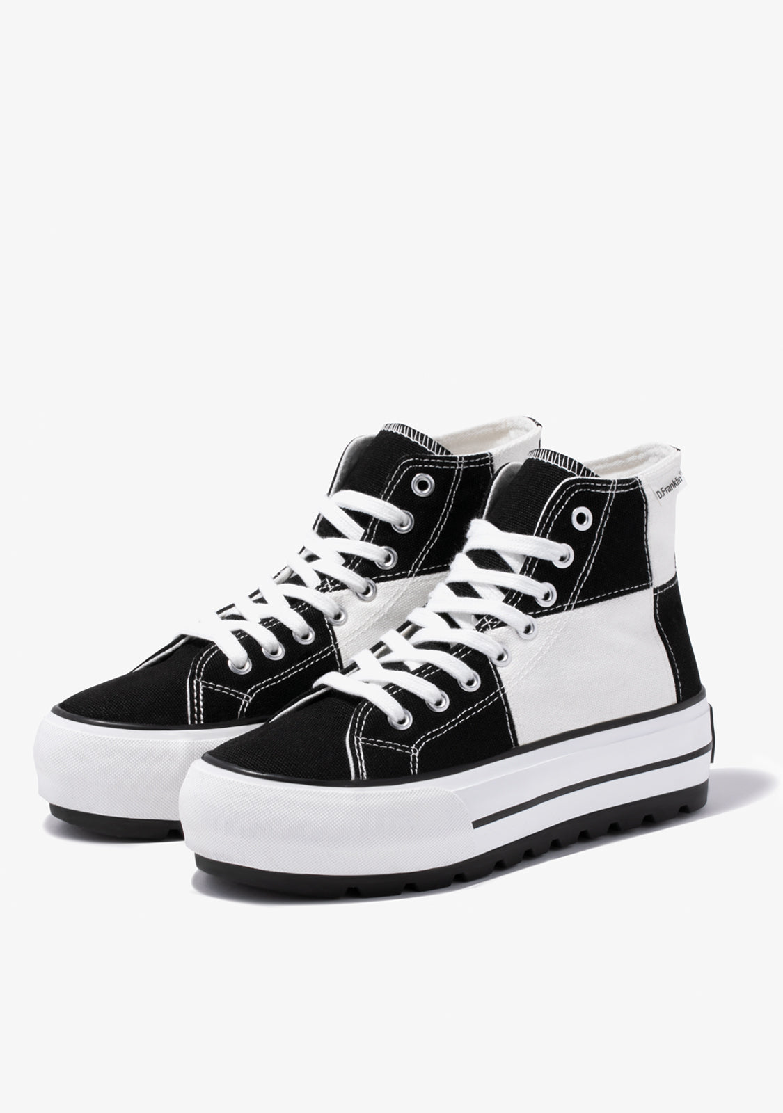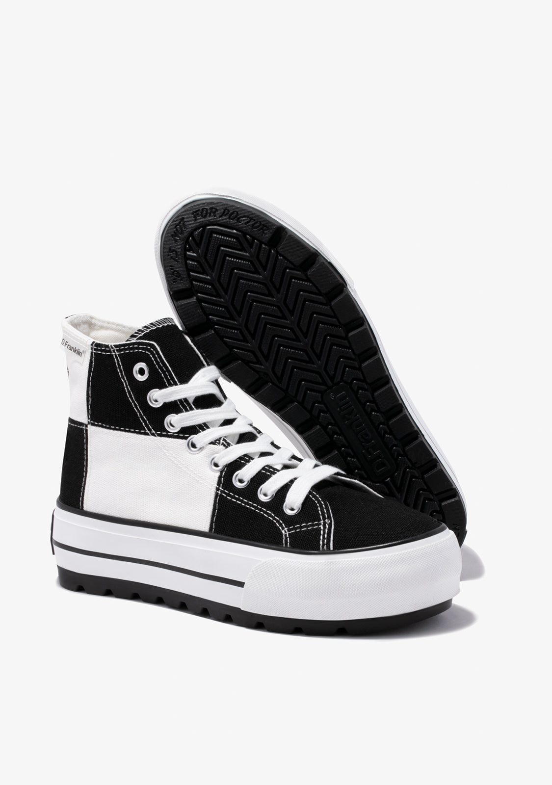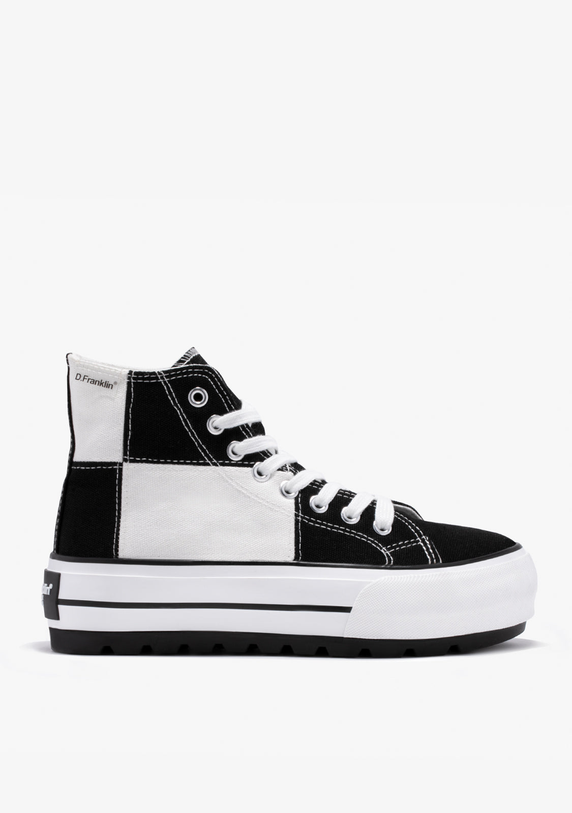 A retro take on the classic One Way high top trainer. Designed in a black and white check pattern. Constructed with a 5cm extra grip lightweight white sole. Black embossed logo on the heel. White cotton laces.
