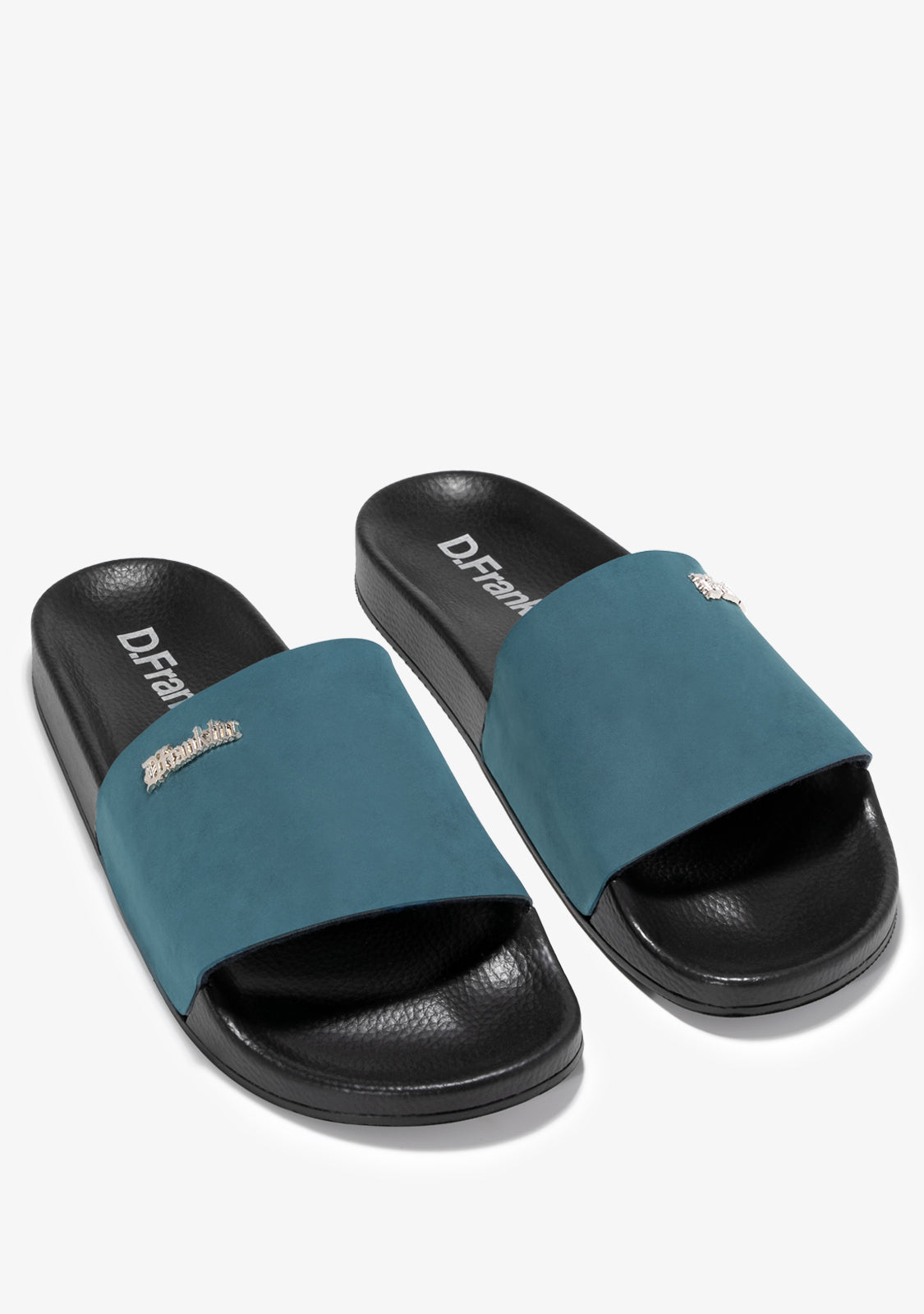 The D.Franklin Pala Slide Patent sandals feature a wide, matte blue synthetic strap for a secure fit. They also feature our D.Franklin emblem on the upper. The footbed design is moulded to fit the shape of the foot perfectly.