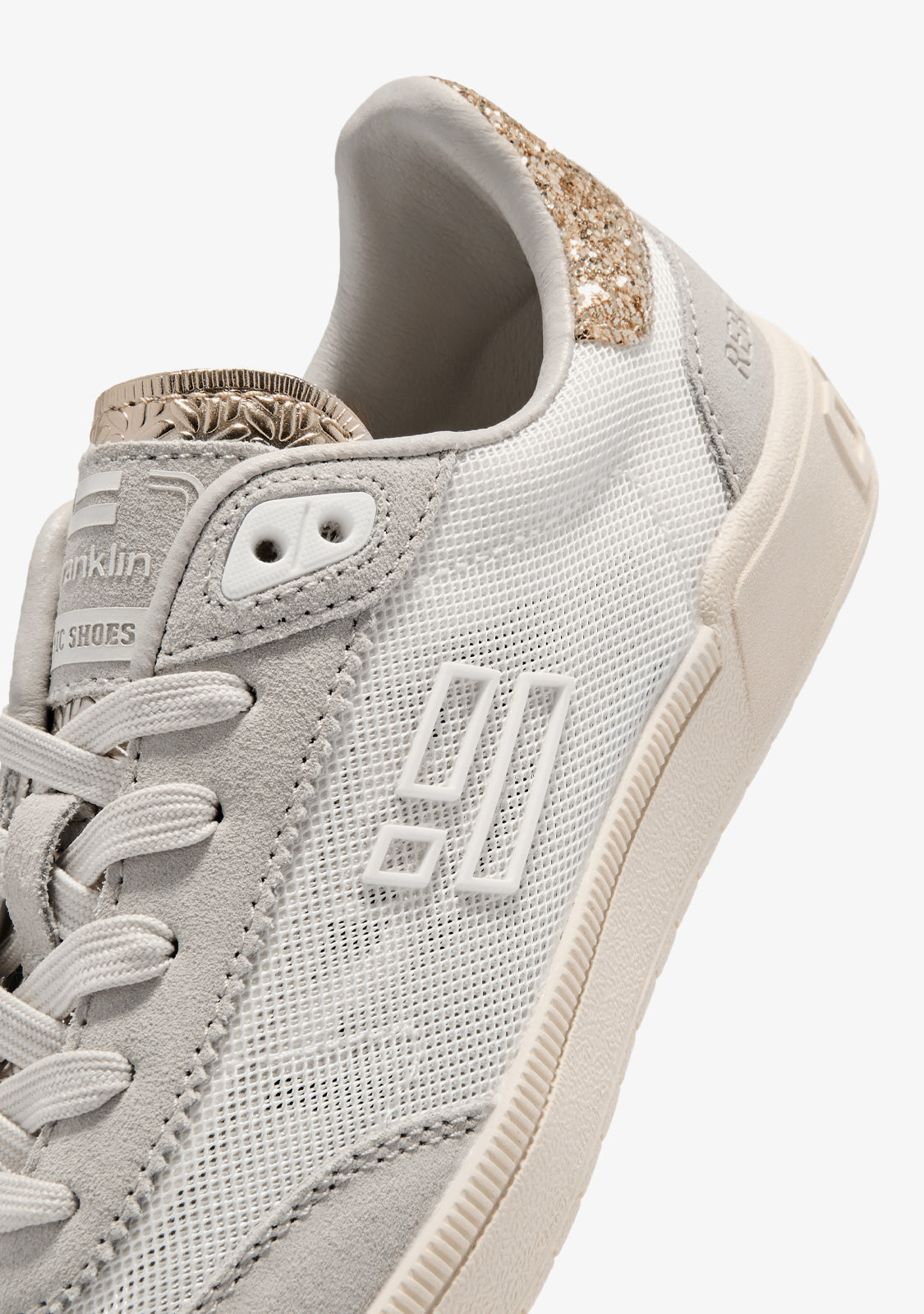Rebel Mesh White / Gold Glitter shows character from the very first step. A crisp white base paired with gold glitter details elevates any look. The mix of breathable mesh and sparkle accents creates a bold, high-contrast finish.