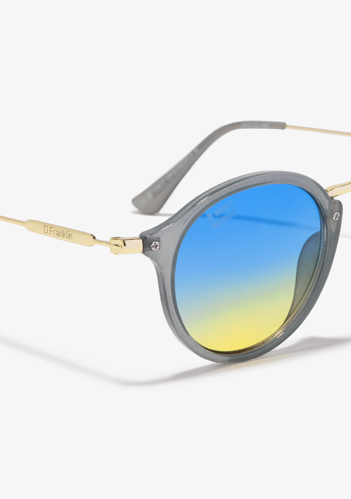 Rounded blue lenses and matching frame tones reinforce the seventies look of this model. It features our signature D.Franklin details: the logo engraved on both metal temples and our emblem on the right lens. With a lens width of 49mm and a 148mm front frame, these glasses suit most faces. The side temples are 145mm long.