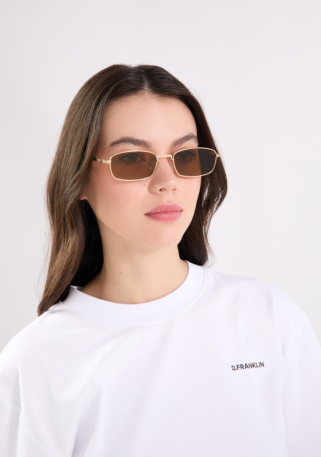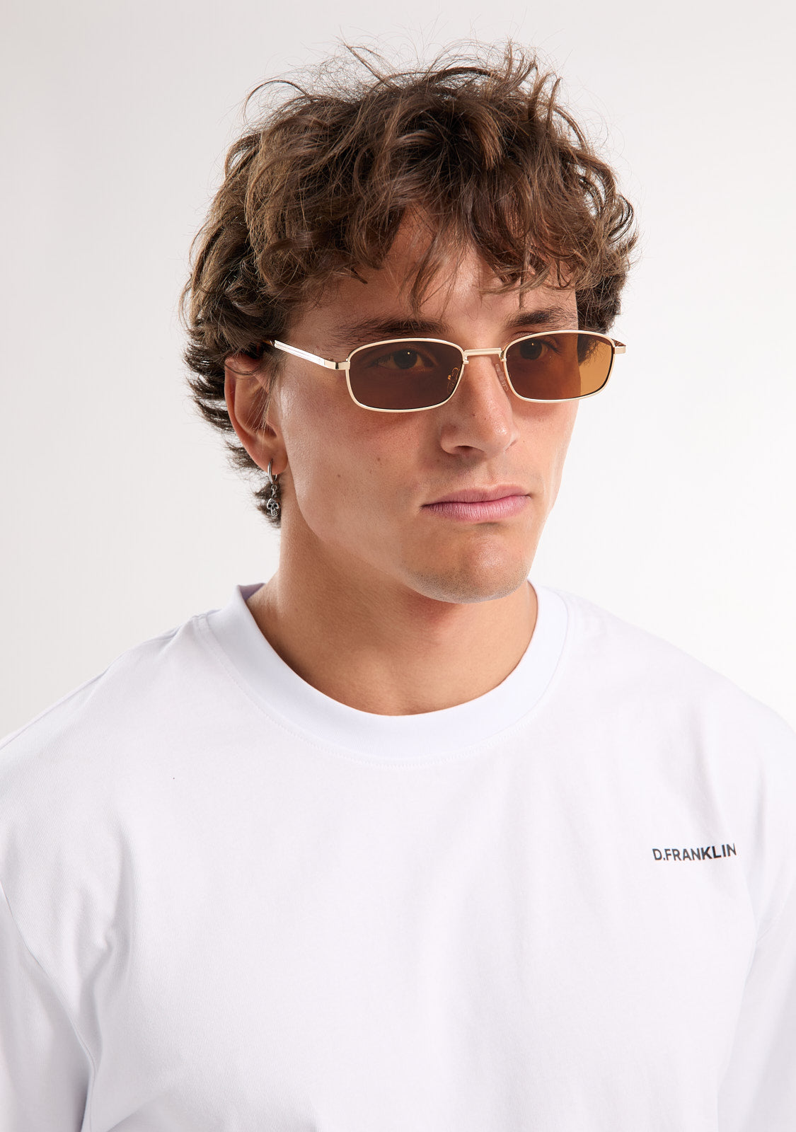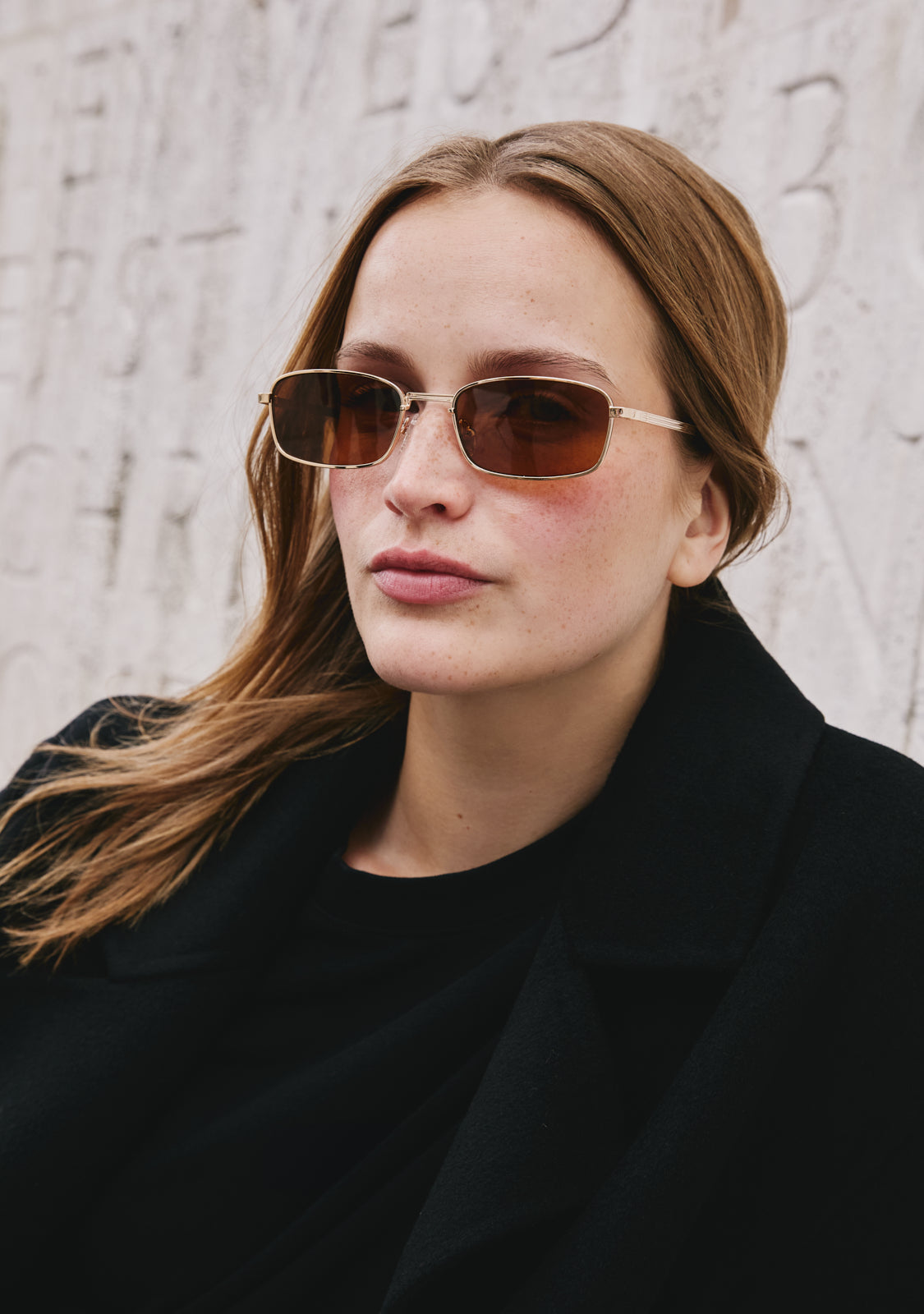 The Square Legacy design features a metallic finish with a rectangular aesthetic. Its gold-tone frame is paired with amber anti-reflective lenses that allow a subtle view through and define the facial features. The front measures 142 mm, and the lens width is 56 mm. The temples are 140 mm long and incorporate our distinctive detailing. A retro yet minimalist piece to frame any outfit.