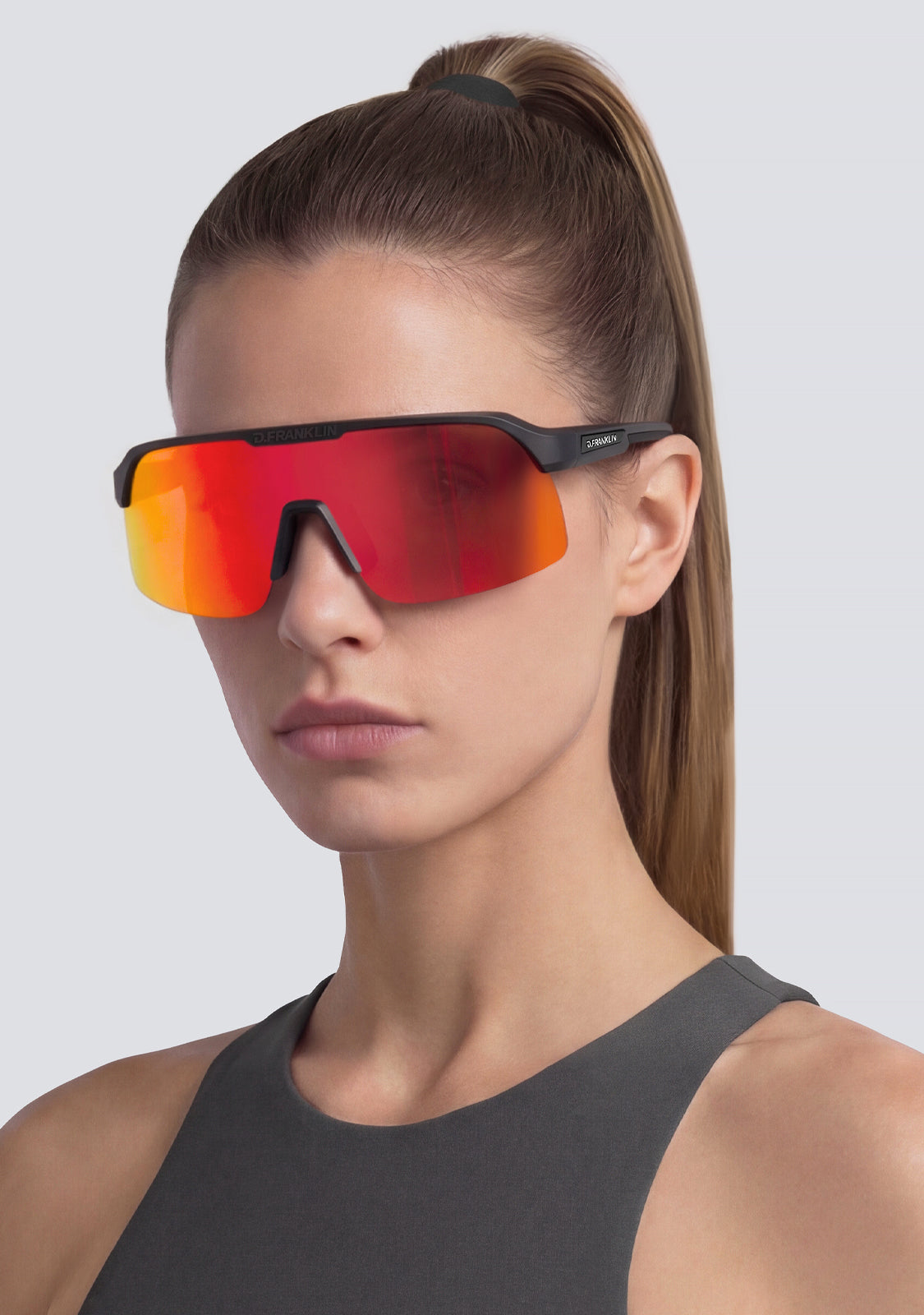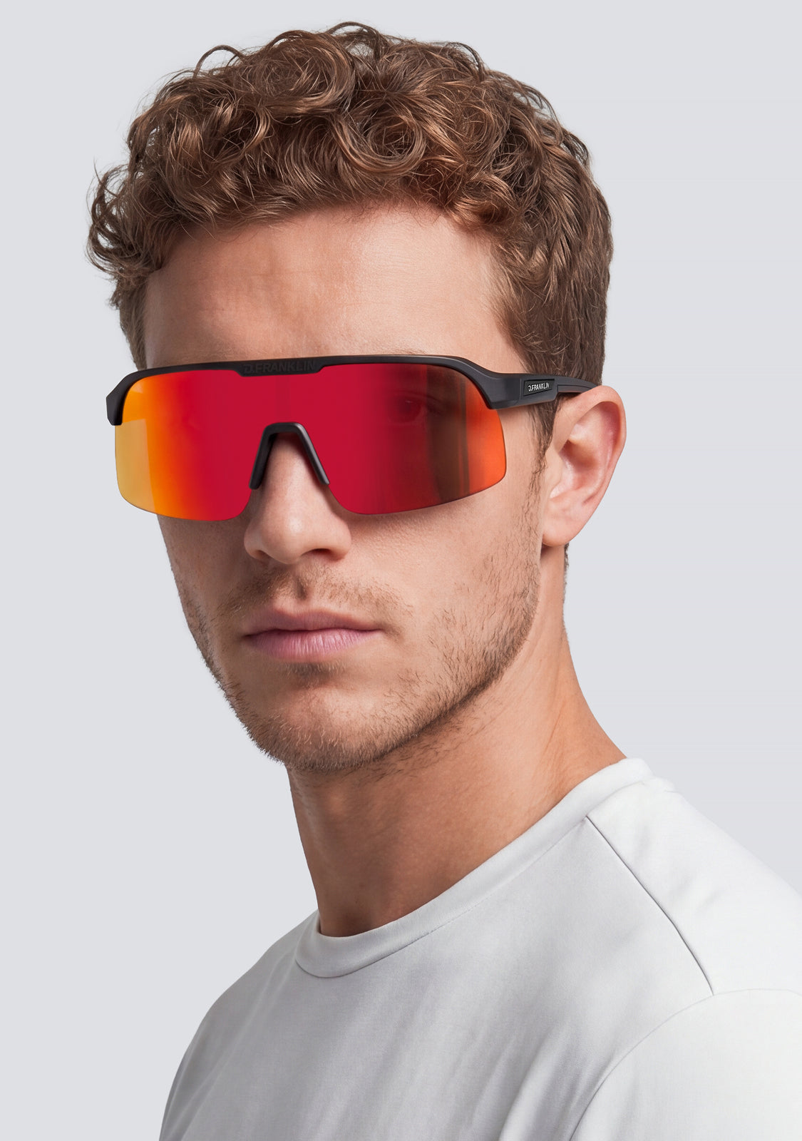 Designed with performance in mind, the new Wind collection by D.Franklin gives you a bold and versatile look that you can confidently wear everywhere. Unmistakable sports sunglasses, created with high quality materials and superior lightness. The Wind Fifty Black / Red model guarantees maximum protection and comfort thanks to its panoramic lenses and silicone nose pads.