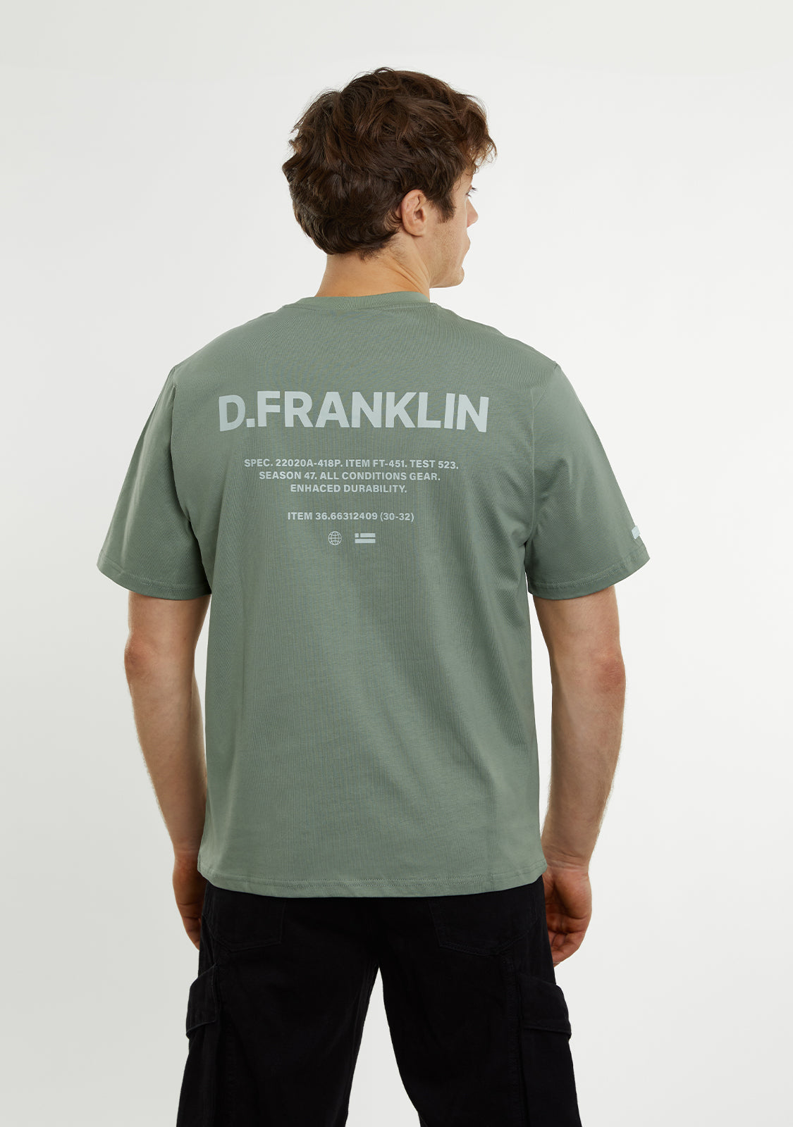 This short-sleeved green t-shirt with a round neckline features the D.Franklin logo on the upper left side in white contrast. Additionally, the back has an exclusive design in the same colour.